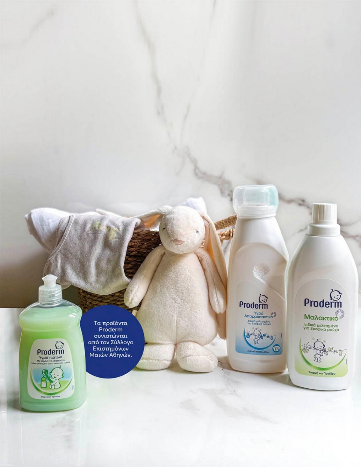 - Υγρό Απορρυπαντικό Proderm. Ειδικά σχεδιασμένο για τα βρεφικά ρούχα, είναι ιδανικό τόσο για χρήση στο πλυντήριο όσο και για πλύσιμο στο χέρι.