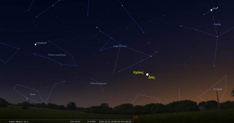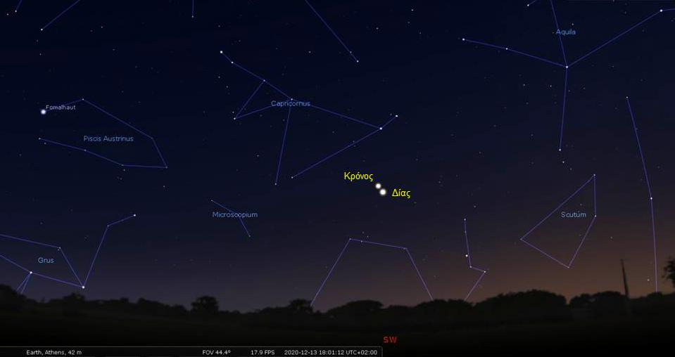 Από τον Σεπτέμβρη ο Δίας και ο Κρόνος πλησιάζουν μεταξύ τους, ώσπου σήμερα θα έχουν επιτύχει την μέγιστη προσέγγιση τους, στις 0,1 μοίρες. Στις εικόνες που ακολουθούν μπορείτε να συγκρίνετε τις θέσεις των πλανητών στον ουρανό στις 13/12 καθώς θα πλησιάζουν και στις 21/12 που θα έχουν πλησιάσει στο μέγιστο.