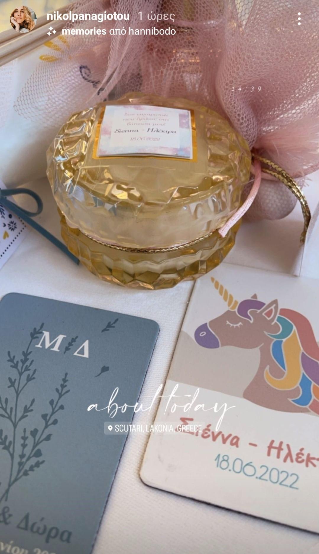 Ανάμεσα στους φίλους και συγγενείς που έδωσαν το παρών στο χαρμόσυνο γεγονός, ήταν και η ενδυματολόγος και κουμπάρα της ηθοποιού, Νικόλ Παναγιώτου, η οποία δημοσίευσε μερικά στιγμιότυπα στον προσωπικό της λογαριασμό στο Instagram.