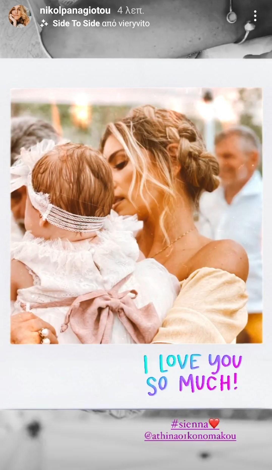 Τόσο το μυστήριο όσο και η δεξίωση της βάπτισης έγιναν στο χωριό Σκουτάρι και το ενός έτους κοριτσάκι πήρε το όνομα Σιέννα-Ηλέκτρα, όπως είχε αποκαλύψει η μαμά της λίγες ημέρες μετά τη γέννησή της. Νονά της μικρής έγινε η Κωνταντίνα Βασιλείου, που εργάζεται στην εταιρεία κοσμημάτων της Αθηνάς Οικονομάκου και με την οποία έχουν αναπτύξει μια πολύ στενή φιλία.