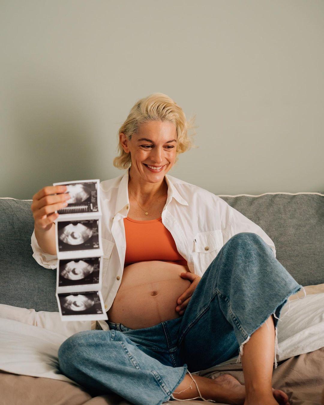 Η 41χρονη αποφάσισε να μοιραστεί με τους followers της την όμορφη περίοδο που βιώνει, με δύο πόζες. Στην πρώτη, η Γιούλικα Σκαφιδά στέκεται όρθια κάνοντας παιχνίδια με το πανέμορφο σκυλάκι της, ενώ στη δεύτερη τη βλέπουμε να κάθεται στον καναπέ και να δείχνει στον φωτογραφικό φακό το υπερηχογράφημά της. Και στις δύο φωτογραφίες, έχει αφήσει ανοιχτό το λευκό πουκάμισό της, ώστε να διακρίνεται η φουσκωμένη κοιλίτσα της.