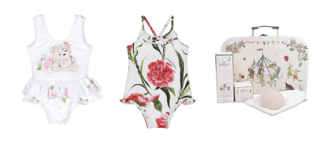 Βρεφικό μαγιό, Monnalisa | Floral ολόσωμο μαγιό, Dolce & Gabbana | Σετ μωρού με pillow mist, κρέμα και φυσικό σφουγγάρι Woodland Friends, Aurelia