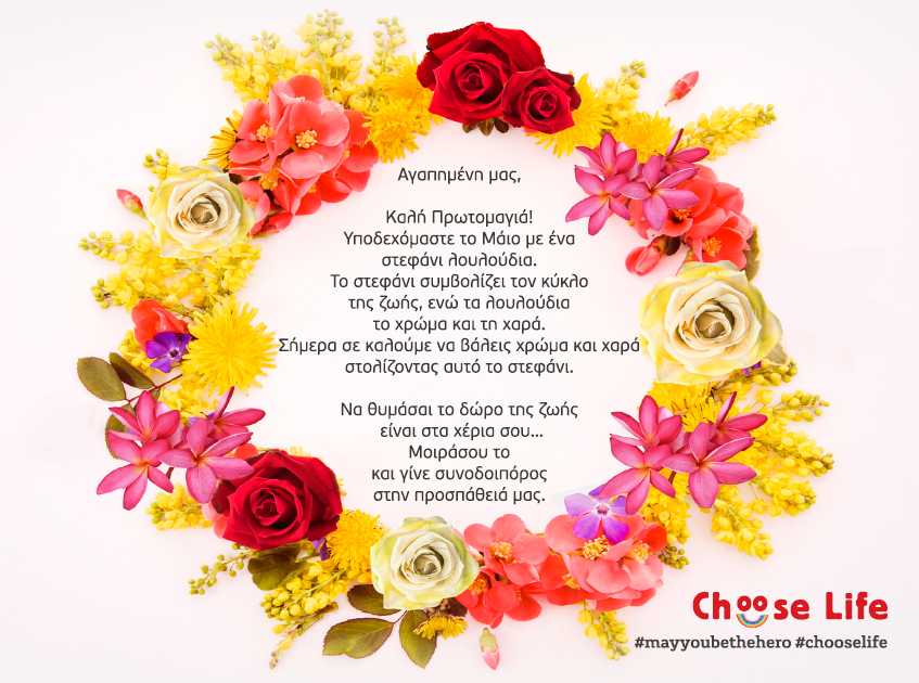 Αυτήν την Πρωτομαγιά, το Choose Life την καλωσορίζει με ένα στεφάνι λουλούδια. Το στεφάνι συμβολίζει τον κύκλο της ζωής, ενώ τα λουλούδια το χρώμα και τη χαρά.