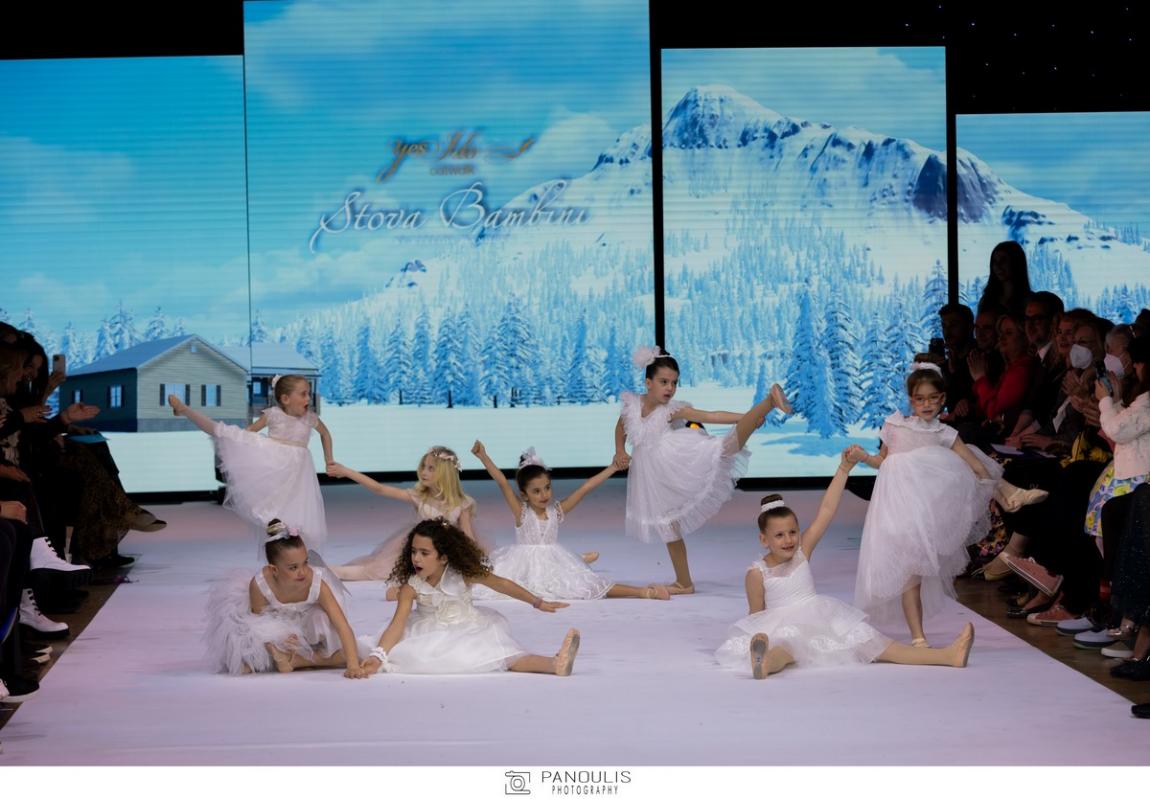 Σαν μικρές νεραϊδούλες, γέμισαν τη σκηνή με τα βγαλμένα από παραμύθι φορέματά τους, όλα Stova Bambini by Stelios Manolas, ραμμένα από γαλλικές βαμβακερές δαντέλες, όλα χειροποίητα και ξεχωριστά, με πρωτότυπο design, τις χαρακτηριστικές αέρινες ασύμμετρες ουρές από φίνο τούλι και statement λουλούδια, γιακάδες και αξεσουάρ. Οι μικρές μπαλαρίνες, που όπως αποδείχτηκε είχαν μελετήσει πολύ καλά τη χορογραφία τους, παρέσυραν το κοινό με την ανεμελιά και την αυθορμητισμό τους και σκόρπισαν vibes χαράς και αισιοδοξίας!