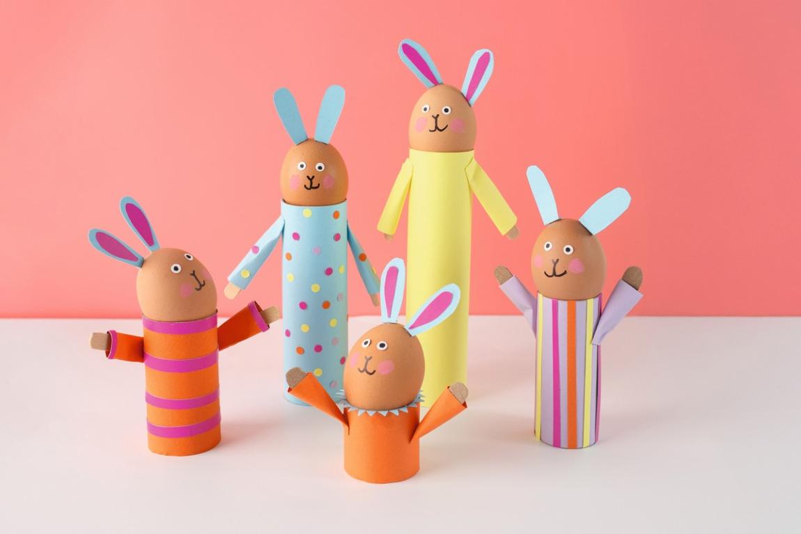 Για το σώμα, φτιάξτε έναν κύλινδρο και χεράκια από χαρτόνι. Για το πρόσωπο, ζωγραφίστε μάτια, μύτη και στόμα πάνω στο αυγό. Τοποθετήστε το αυγό μέσα στον κύλινδρο και κολλήστε αυτάκια από χαρτόνι στο πάνω μέρος του.