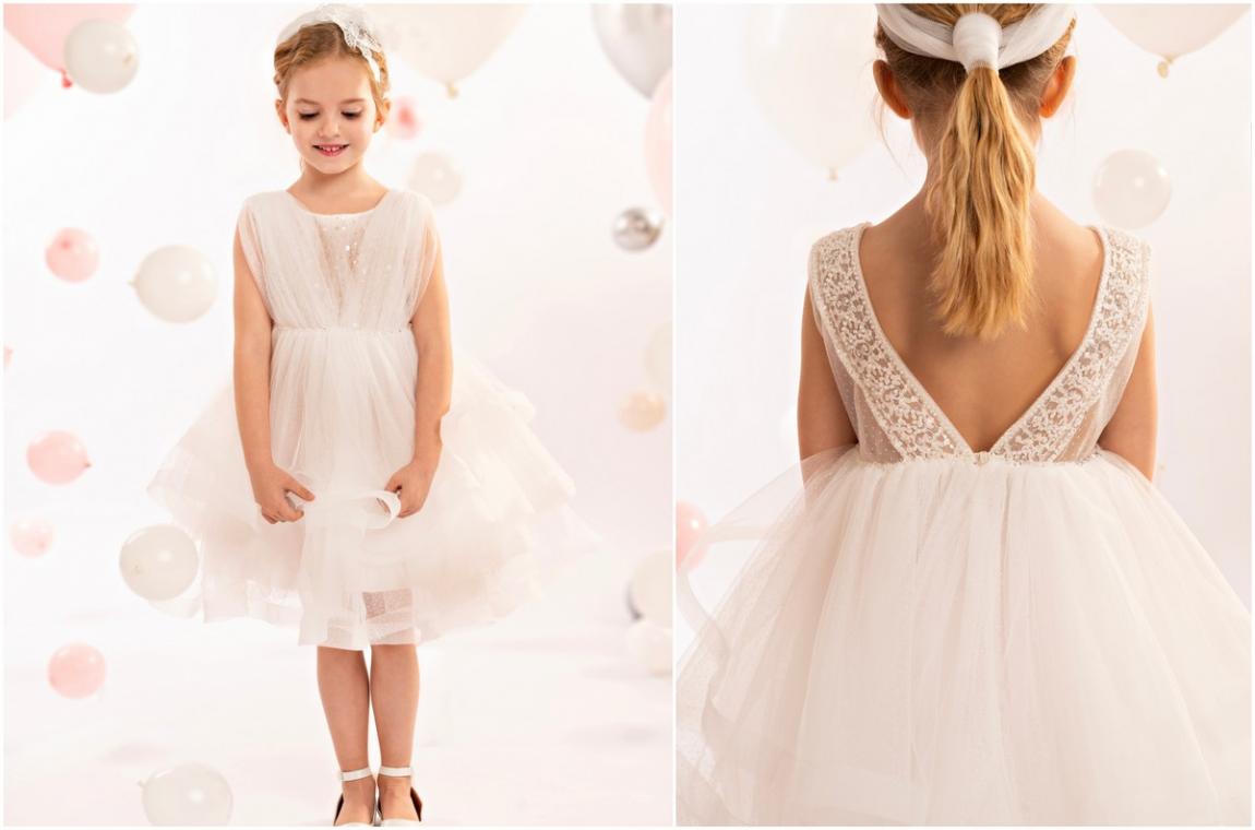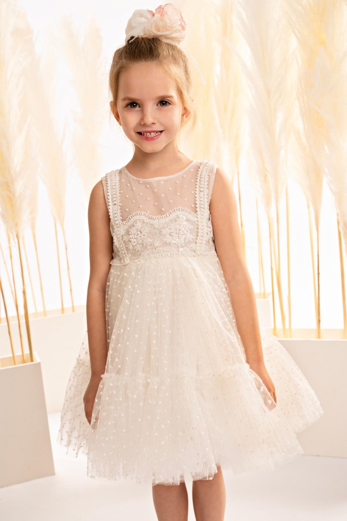 Φόρεμα από λεπτό πουά κεντημένο τούλι, με διάφανες παγέτες, σουρωτή φούστα και λεπτομέρειες από γαλλική δαντέλα.