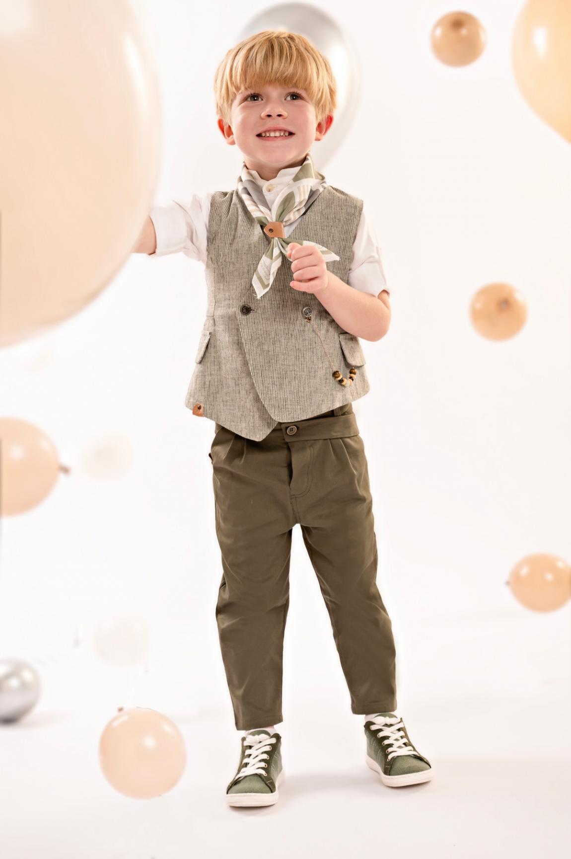 Σετ με δίπιετο παντελόνι, γιλέκο με πέτο, oxford πουκάμισο, παπιγιόν, personalized βουάλ φουλάρι και τιράντες.