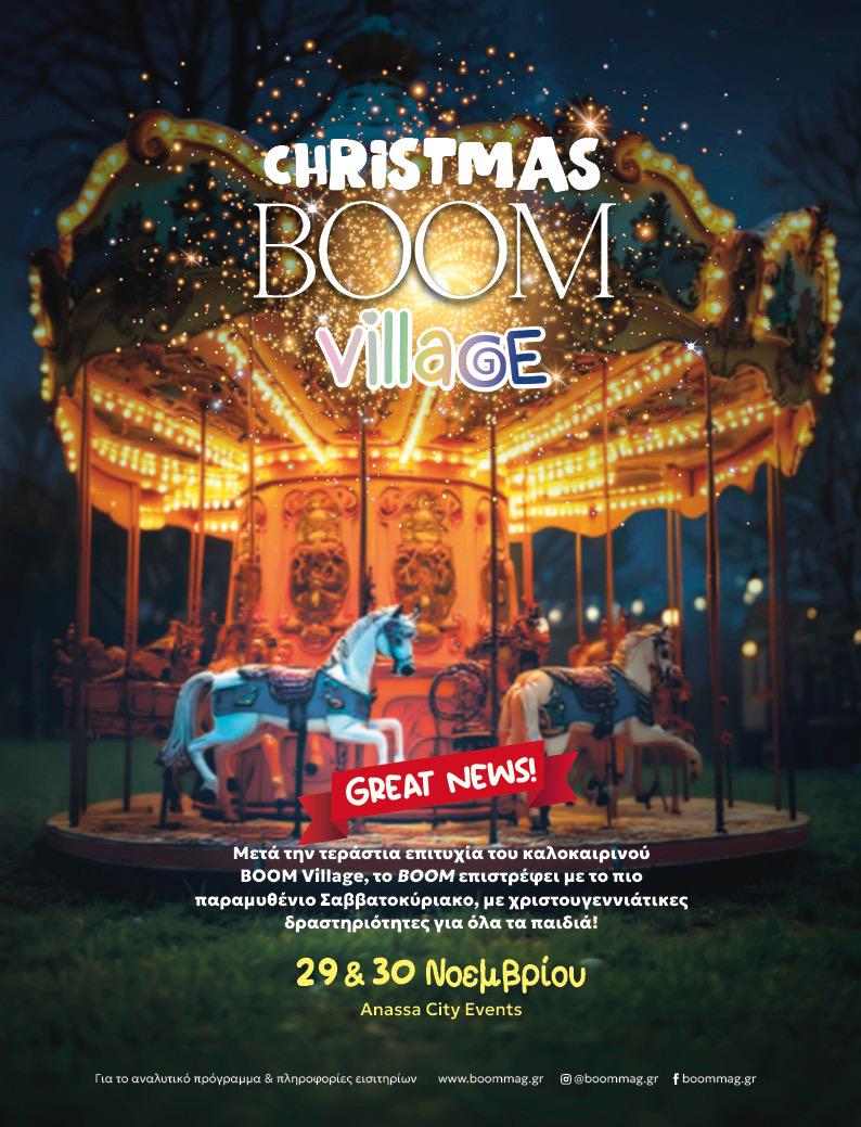 Μετά την τεράστια επιτυχία του καλοκαιρινού BOOM Village που έγινε sold out και φιλοξένησε 6.000 καλεσμένους, η ομάδα του ΒΟΟΜ επιστρέφει με ένα παραμυθένιο χριστουγεννιάτικο χωριό για όλη την οικογένεια!