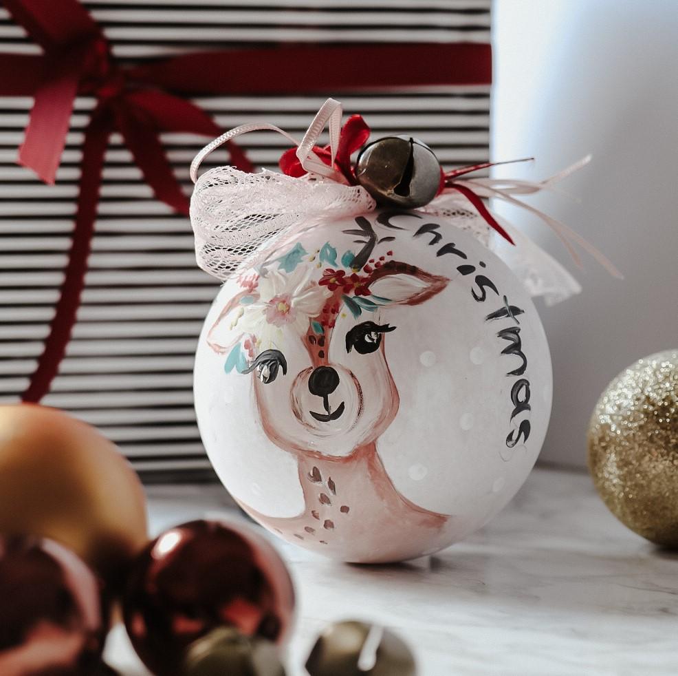 Τα πρώτα Χριστούγεννα του μωρού σας θα μείνουν αξέχαστα χάρη σε αυτή τη χειροποίητη μπάλα -ζωγραφισμένη στο χέρι- με βελούδινες κορδέλες και κουδουνάκι.