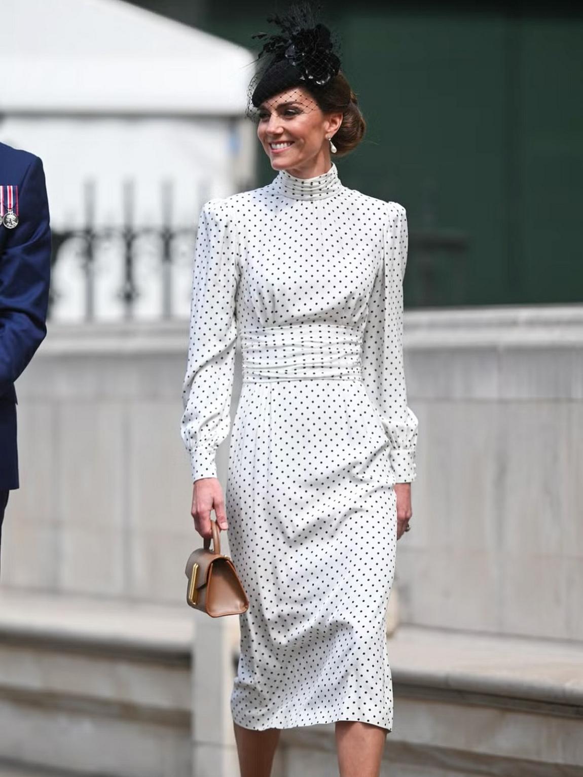 Στη λειτουργία των Ευχαριστιών για την 80ή επέτειο της Ημέρας της Νίκης στο Αββαείο του Westminster, τον Μάιο του 2025, η Kate φόρεσε ένα λευκό, πουά, midi φόρεμα με turtleneck και όγκο στους ώμους του brand Alessandra Rich. Το look απογείωσε με μαργαριταρένια σκουλαρίκια με διαμάντια της πριγκίπισσας Diana και nude mini bag, ενώ αξίζει να σημειωθεί πως με το ίδιο σύνολο είχε εμφανιστεί και την Ημέρα του Τάγματος της Περικνημίδας, τον Ιούνιο του 2023. Συνηθίζει άλλωστε να ανακυκλώνει τα ρούχα της, δείχνοντας έμπρακτα την οικολογική της συνείδηση και το πόσο στηρίζει τη βιωσιμότητα της μόδας.