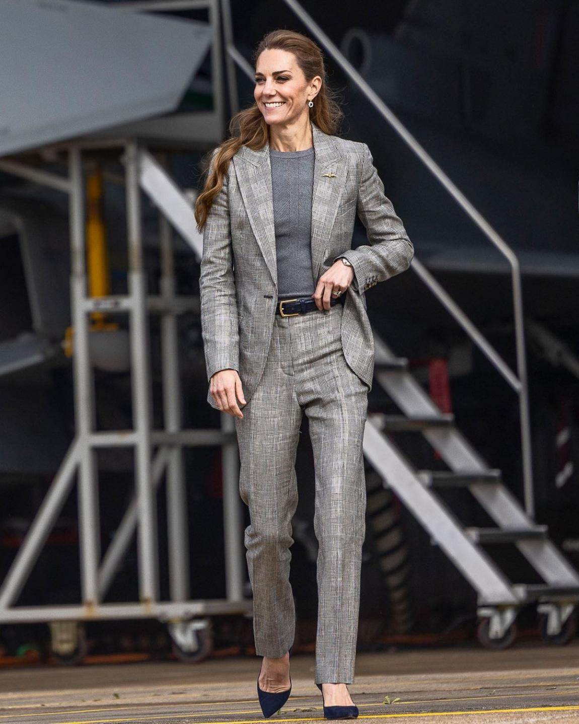 Με tailored παντελόνι, λεπτή ζώνη, σακάκι μέχρι την περιοχή των γοφών, navy blue γόβες και ένα super natural beauty look, η πριγκίπισσα της Ουαλίας μαγνήτισε τα βλέμματα κάνοντας την τέλεια πρόταση για ένα πρωινό, office-style look.