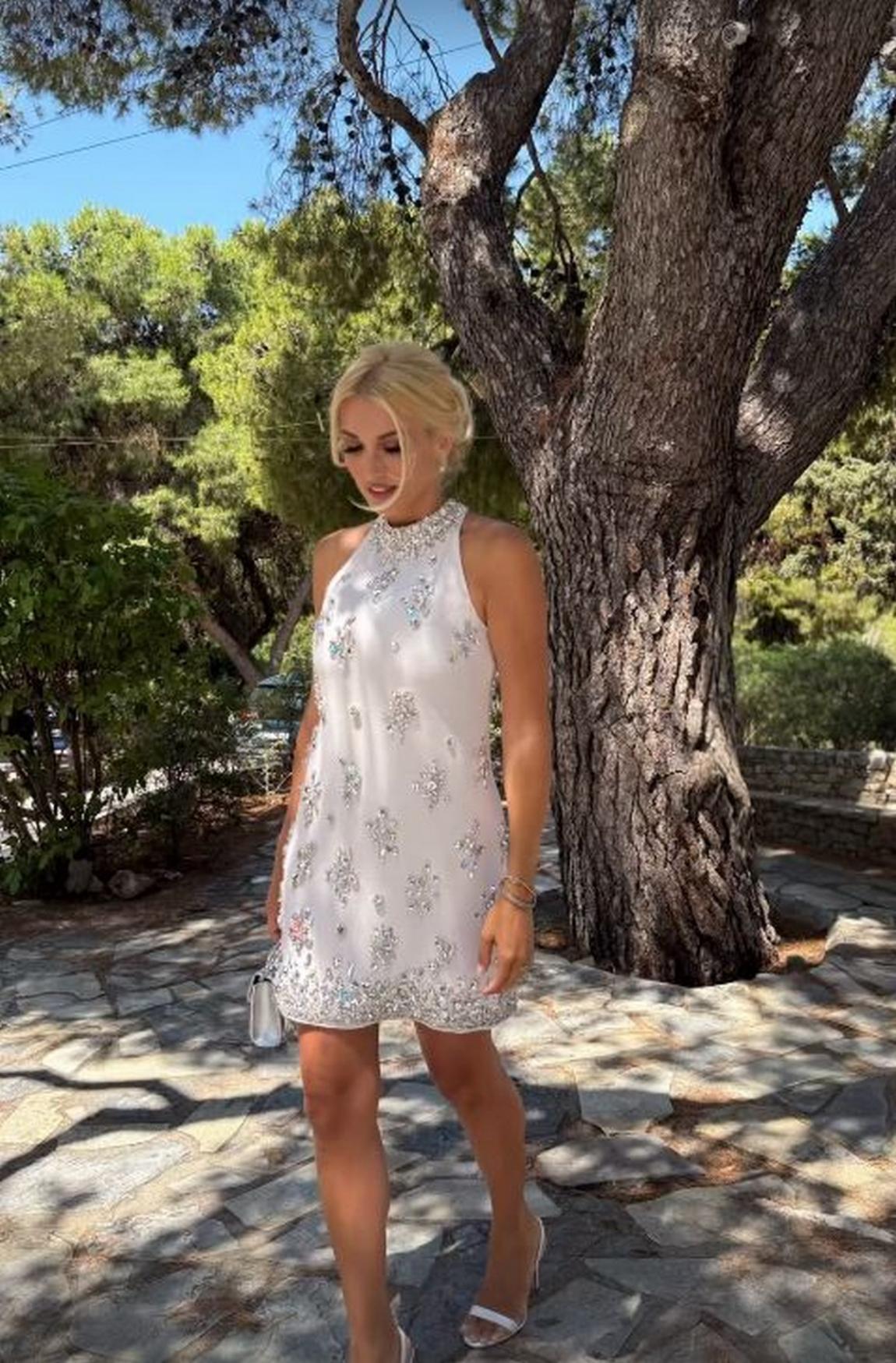 Η Κωνσταντίνα Σπυροπούλου εντυπωσίασε στη βάφτιση του γιου της με δύο διαφορετικά σύνολα διά χειρός Celia Kritharioti. Η παρουσιάστρια επέλεξε για την τελετή ένα λευκό mini φόρεμα με halter neck και κρύσταλλα, πέδιλα και clutch bag στο ίδιο χρώμα, ενώ στα μαλλιά έκανε έναν επιμελώς ατημέλητο κότσο.