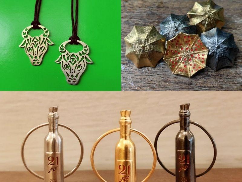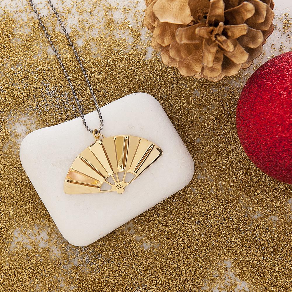Maya Zoulovits, μακρύ κολιέ σε τρία χρώματα: χρυσό, μαύρο χρυσό και ροζ χρυσό. Η Μάγια καλωσορίζει το 2021 με ένα γούρι που είναι εμπνευσμένο από τη γυναικεία κομψότητα και θελκτικότητα. Το σχήμα της βεντάλιας συμβολίζει τη ζωή, αρχίζοντας από το σημείο του κέντρου και επεκτεινόμενη, καθώς η εμπειρία της ζωής διευρύνεται. Έτσι και εμείς, κρατώντας τη βεντάλια κρατάμε οι ίδιοι το μέλλον στα χέρια μας. Με την δύναμη έχουμε δίνουμε την κατεύθυνση στη ζωή μας προς τα εκεί που επιθυμούμε ελκύοντας καθετί καλό, όπως ακριβώς και ο κινούμενος αέρας από τη βεντάλια που δηλώνει τη δύναμη και το μεγαλείο αλλά και την απομάκρυνση της κακής ενέργειας.
