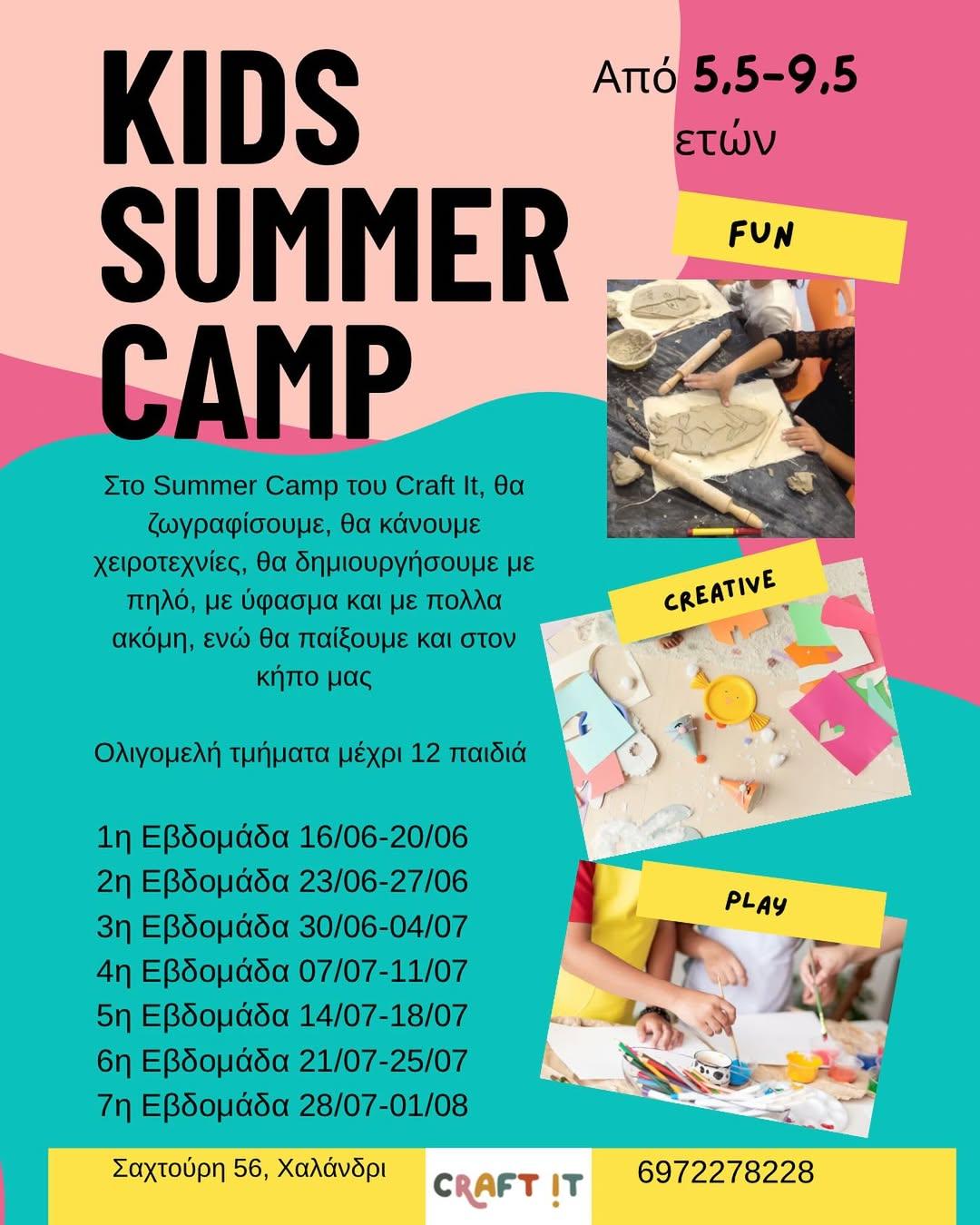 Εδώ κάθε μέρα θα είναι μια νέα περιπέτεια γεμάτη χρώματα και δημιουργία. Από ζωγραφική και πηλό μέχρι μοναδικές χειροτεχνίες και ζωγραφική σε ύφασμα, οι μικροί καλλιτέχνες θα έχουν την ευκαιρία να εκφραστούν και να αναδείξουν τη φαντασία τους. Αφού ολοκληρώνουν τα έργα τους καθημερινά τα παιδιά (ηλικίας 5,5-9,5 ετών) θα ζουν στιγμές χαλάρωσης και παιχνιδιού στον καταπράσινο κήπο, απολαμβάνοντας τη φύση και την παρέα. @craftitartschool | craftitschool@gmail.com, 6972278228
