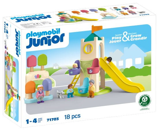 Στην Παιδική χαρά της PLAYMOBIL JUMIOR, η διασκέδαση δεν τελειώνει ποτέ! Οι μικροί μας φίλοι θα ανακαλύψουν πολλά και διαφορετικά παιχνίδια. Πρώτα θα επισκεφθούν τη ρόδα του λούνα παρκ που περιστρέφεται γυρνώντας την ειδική λαβή. Μετά είναι ώρα για τσουλήθρα, όπου υπάρχει μία ξεχωριστή λειτουργία: Αν τοποθετήσετε μία φιγούρα PLAYMOBIL πάνω στην επίπεδη πλατφόρμα στην αρχή της τσουλήθρας, τότε αυτή αρχίζει να μετακινείται προς την τσουλήθρα μέχρι να γλιστρήσει από μόνη της προς τα κάτω. Με αυτόν τον τρόπο τα παιδιά είναι σε θέση να μάθουν τις απλές, καθημερινές λειτουργίες και να αντιληφθούν τη σχέση αιτίας-αιτιατού μέσα από το παιχνίδι. Και φυσικά, μετά από τόσο παιχνίδι και τόσες ανακαλύψεις, ήρθε η στιγμή για ένα παγωτάκι! Στο παγωτατζίδικο, τα παιδιά μαθαίνουν τα χρώματα και πώς να τα ταξινομούν, ενώ παράλληλα εστιάζουν στις σύνθετες δράσεις και μπαίνουν στον κόσμο των παιχνιδιών μίμησης.