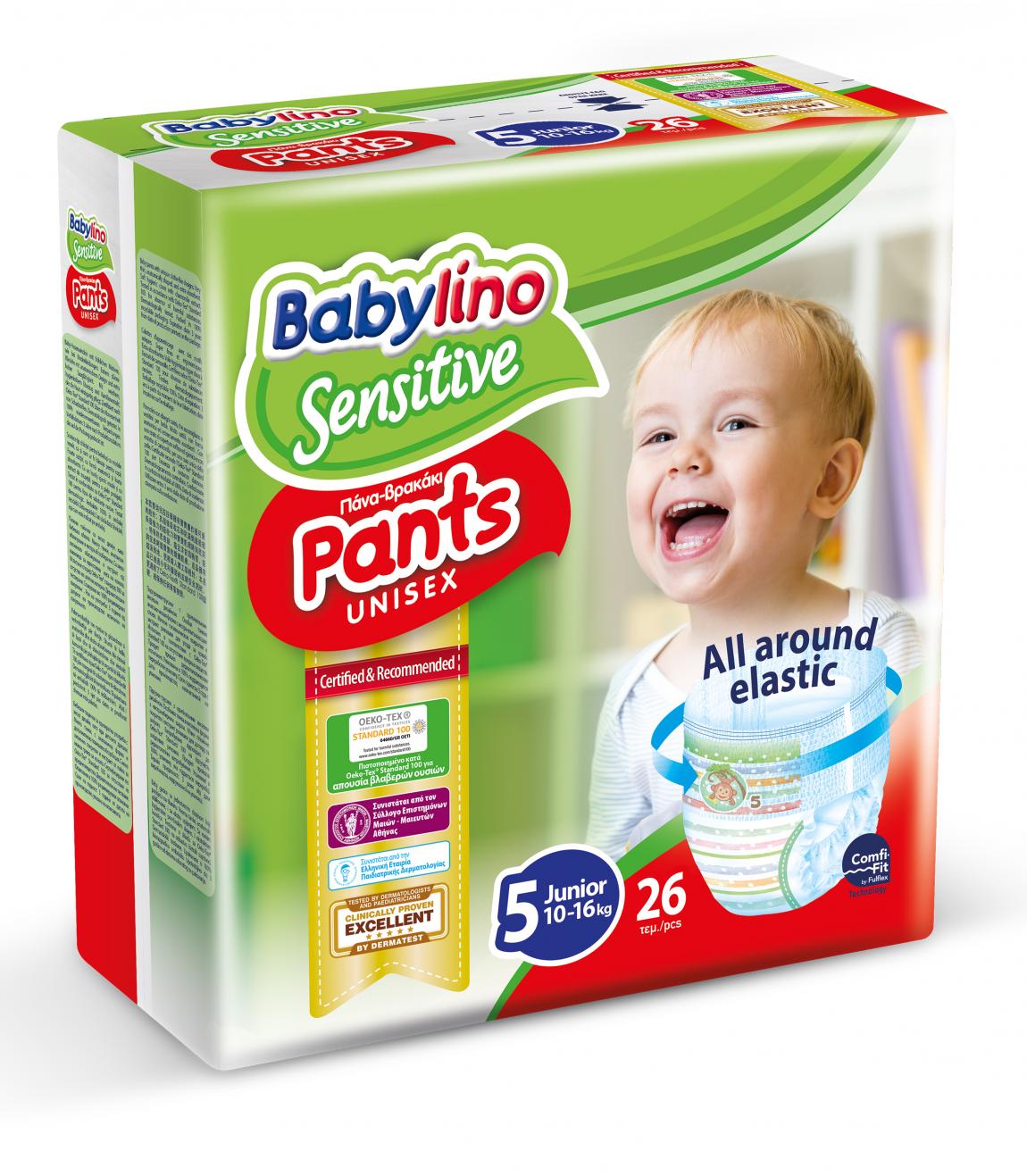 Σε όλες τις παραπάνω ερωτήσεις, η απάντηση είναι μία: οι νέες Babylino Sensitive Pants! Χάρη στον πρωτοποριακό All around elastic σχεδιασμό τους και την καινοτόμο τεχνολογία, εξασφαλίζουν άψογη εφαρμογή, άριστη απορροφητικότητα, αλλά και ουσιαστική και αποδείξιμη φιλική προστασία στο δέρμα.