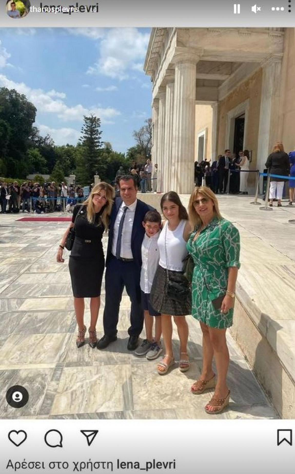 Στο πλευρό του Θάνου Πλεύρη βρέθηκαν τα δύο παιδιά του, αλλά και η σύζυγός του, Λένα Παπαθεολόγου, η οποία δημοσίευσε μία κοινή τους φωτογραφία στο Instagram και ευχήθηκε: «καλή θητεία αγάπη μου».