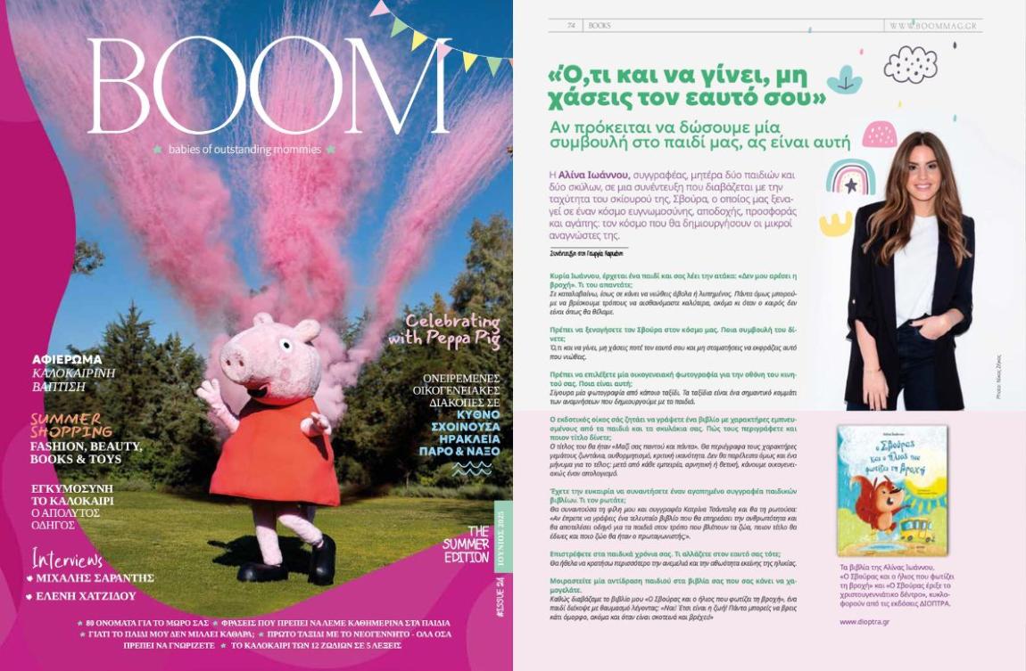 Η Αλίνα Ιωάννου, συγγραφέας, μητέρα δύο παιδιών και δύο σκύλων, σε μια συνέντευξη που διαβάζεται με την ταχύτητα του σκίουρού της, Σβούρα, ο οποίος μας ξεναγεί σε έναν κόσμο ευγνωμοσύνης, αποδοχής, προσφοράς και αγάπης: τον κόσμο που θα δημιουργήσουν οι μικροί αναγνώστες της.