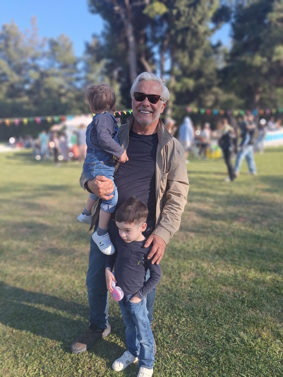 Χαλαρός και αυθόρμητος, ο παρουσιαστής πόζαρε στον φωτογραφικό φακό, ενώ λίγο πιο πέρα η σύζυγός του, Κωνσταντίνα Καραλέξη, απολάμβανε το παιχνίδι με την κόρη τους.