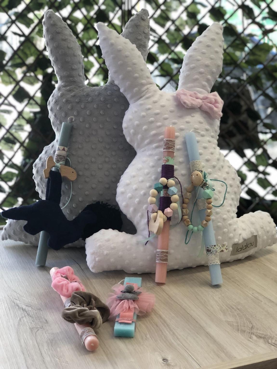 Εντυπωσιακοί διπλοί φιόγκοι από γκρο κορδέλα, κουνελάκια, τσιμπιδάκια με πέρλες, βραχιόλια που γράφουν mommy και dad, ιδιαίτερα μπρελόκ και πολλά άλλα χειροποίητα αξεσουάρ στολίζουν υπέροχα τις λαμπάδες, που είναι όλες αρωματικές!