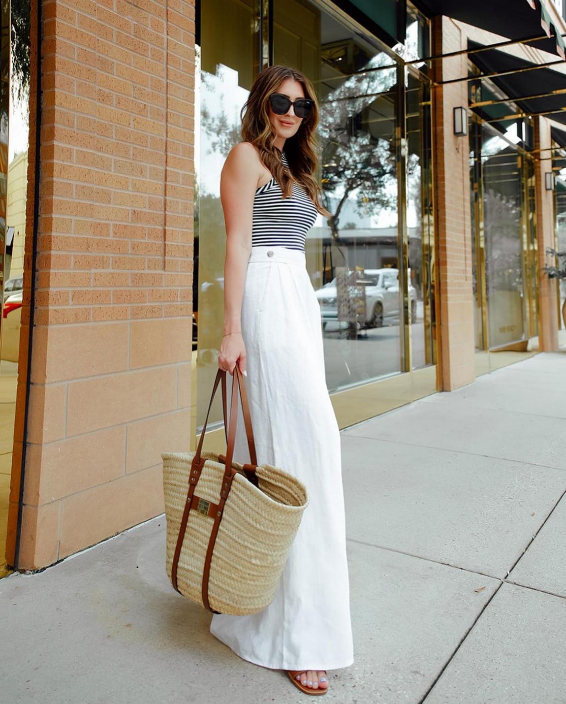 Ένα ριγέ top σε λευκό και μπλε και μία straw bag αρκούν για να απογειώσουν το απόλυτο summer pant trend.
