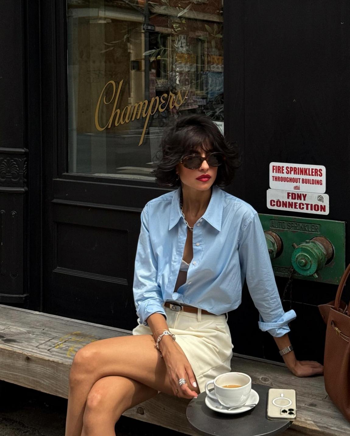 Συνδυάστε ένα σορτς με το μαγιό σας ή με bra top, και ολοκληρώστε το outfit με ένα all-time classic σιέλ πουκάμισο, το οποίο δεν θα κουμπώσετε, αλλά θα δέσετε κόμπο στην περιοχή της κοιλιάς. Και κάπως έτσι είστε έτοιμη για τον πρωινό καφέ με τις φίλες σας!