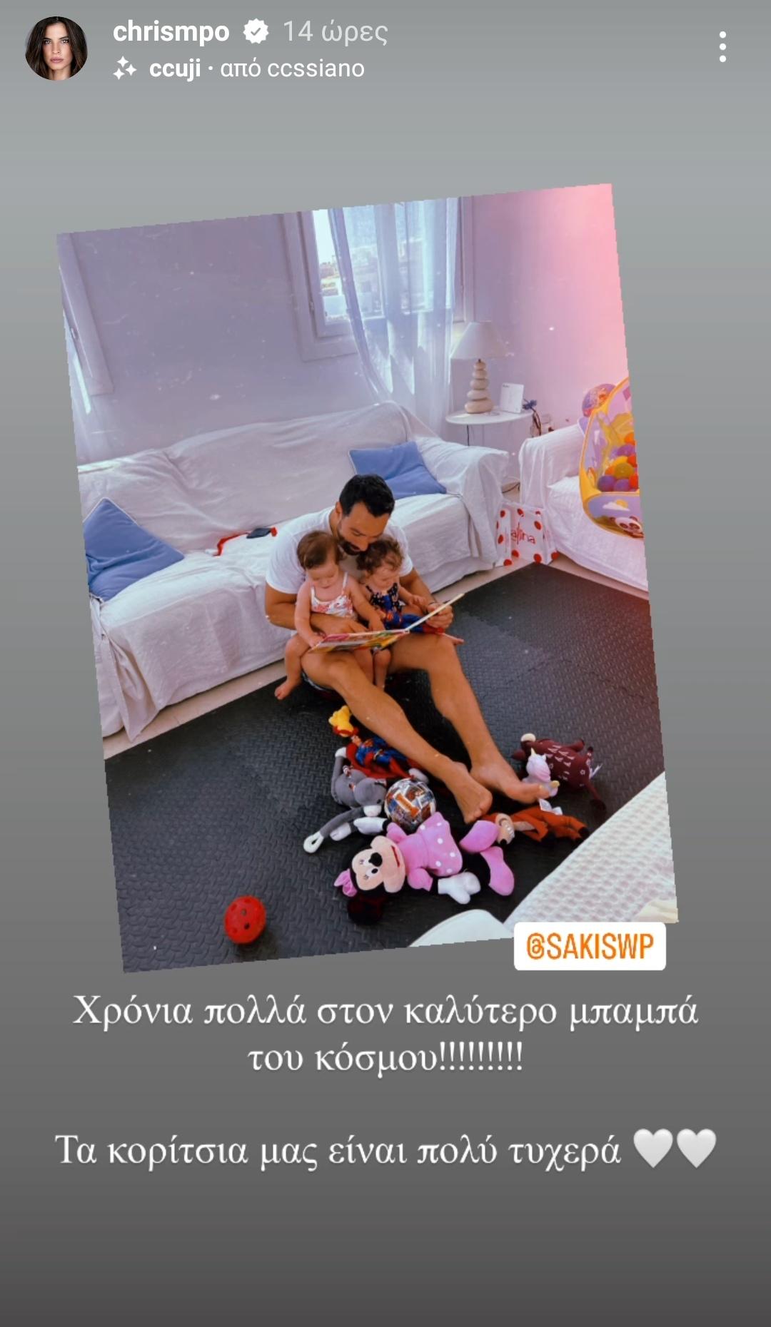 Πρώτη φορά γιόρτασε φέτος ως μπαμπάς ο Σάκης Τανιμανίδης και η σύζυγός του, Χριστίνα Μπόμπα, θέλησε να του ευχηθεί με μια χαριτωμένη φωτογραφία στην οποία ποζάρει αγκαλιά με τις δίδυμες κόρες του διαβάζοντάς τους παραμύθια. «Χρόνια πολλά στον καλύτερο μπαμπά του κόσμου! Τα κορίτσια μας είναι πολύ τυχερά!», έγραψε στη φωτογραφία.