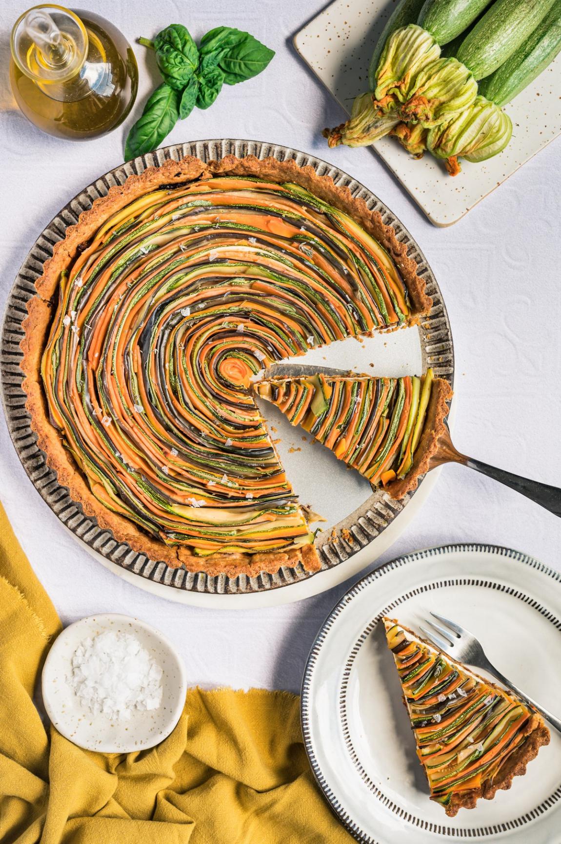 Βλέποντάς την κανείς από πάνω, μοιάζει με έναν λαβύρινθο που στο κέντρο του κρύβει όλη τη νοστιμιά των λαχανικών που πρωταγωνιστούν αυτή την εποχή. Το σίγουρο είναι, πως αν το καλοκαίρι ήταν συνταγή, θα έμοιαζε με αυτή την πολύχρωμη και πρωτότυπη τάρτα, που θα κλέψει τις εντυπώσεις σε κάθε τραπέζι! Πάρτε μολύβι και χαρτί, σημειώστε τα υλικά και καλή επιτυχία!