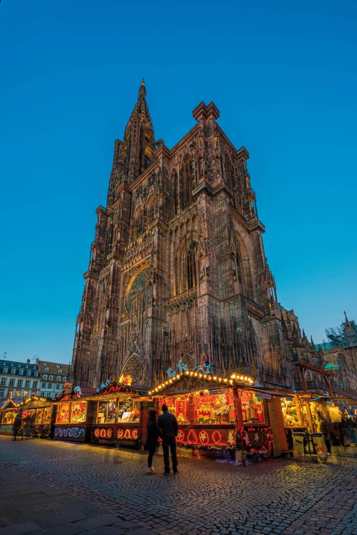 Πρώτος σταθμός είναι η Place de la Cathédrale, που έχει μεταμορφωθεί σε ένα ονειρεμένο σκηνικό! Μία από τις πιο εμβληματικές χριστουγεννιάτικες αγορές ζωντανεύει εδώ, με ξύλινα σπιτάκια που πωλούν χειροποίητα στολίδια, κεραμικά αλλά και τοπικές σπεσιαλιτέ, όπως pain d’épices (μελόψωμο), bredele (παραδοσιακά μπισκότα σε διάφορες γεύσεις) και ζεστό κρασί. Σήμα κατατεθέν, ο Καθεδρικός Ναός της Παναγίας, που υψώνεται επιβλητικά στην καρδιά της πλατείας. Αν αντέχετε, μπορείτε να ανεβείτε στον πύργο με τα 332 σκαλιά, για να θαυμάσετε την πανοραμική θέα του Στρασβούργου!