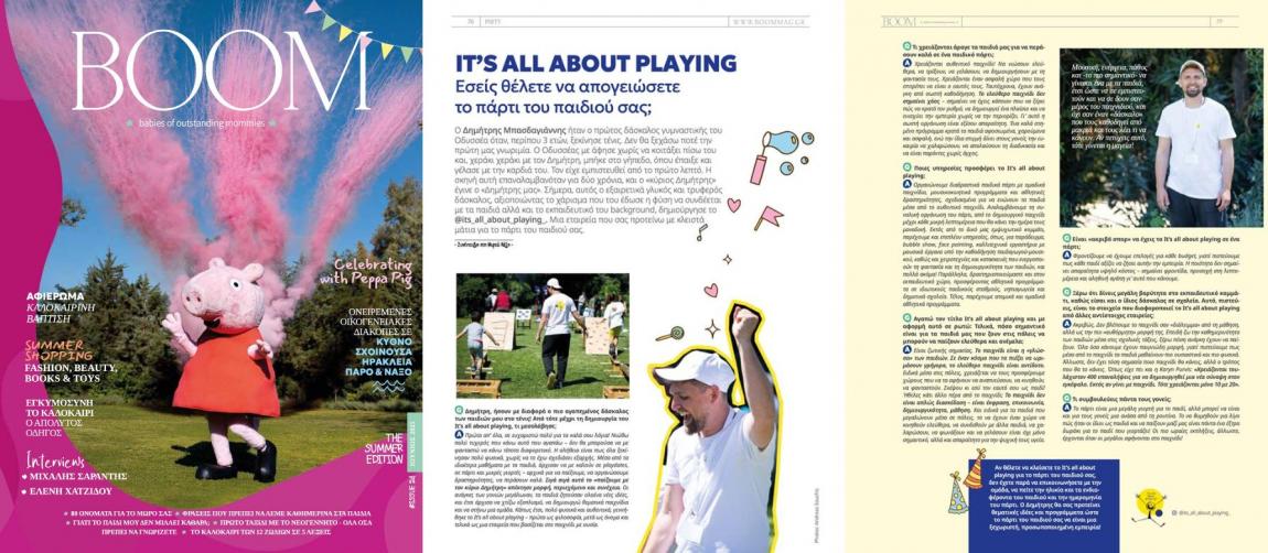 BOOM note: Αν θέλετε να κλείσετε το It’s all about playing για το πάρτι του παιδιού σας, δεν έχετε παρά να επικοινωνήσετε με την ομάδα, να πείτε την ηλικία και τα ενδιαφέροντα του παιδιού και την ημερομηνία του πάρτι. Ο Δημήτρης θα σας προτείνει θεματικές ιδέες και προγράμματα ώστε το πάρτι του παιδιού σας να είναι μια ξεχωριστή, προσωποποιημένη εμπειρία!