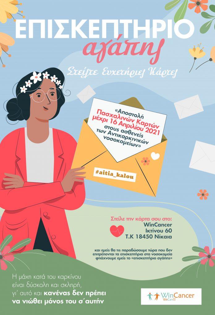 «Η μάχη κατά του καρκίνου είναι δύσκολη και σκληρή, γι’ αυτό και κανένας δεν πρέπει να νιώθει μόνος του σ’ αυτήν», γράφει πάνω η κάρτα που ετοίμασε η οργάνωση του Win Cancer, η οποία σκέφτηκε για φέτος το Πάσχα να πραγματοποιήσει ένα διαφορετικό «επισκεπτήριο» αγάπης, για όλους τους ασθενείς των Αντικαρκινικών νοσοκομείων της χώρας μας. Παροτρύνει, λοιπόν, τον κόσμο να φτιάξει τις δικές του ευχετήριες κάρτες, γεμάτες αγάπη και μηνύματα αισιοδοξίας για τη δύσκολη διαδρομή που διανύουν όσοι παλεύουν με τον καρκίνο. Οι κάρτες που θα παραδώσει ο κόσμος θα συγκεντρωθούν από τα μέλη της εθελοντικής οργάνωσης και αφού πλαστικοποιηθούν, θα παραδοθούν στους ασθενείς. Στις κάρτες, μπορεί κανείς να γράψει απλές ευχές για τη γιορτή του Πάσχα ή κάποια λόγια που θα ενθαρρύνουν τους ανθρώπους που δίνουν αυτή την τόσο δύσκολη και άνιση μάχη.