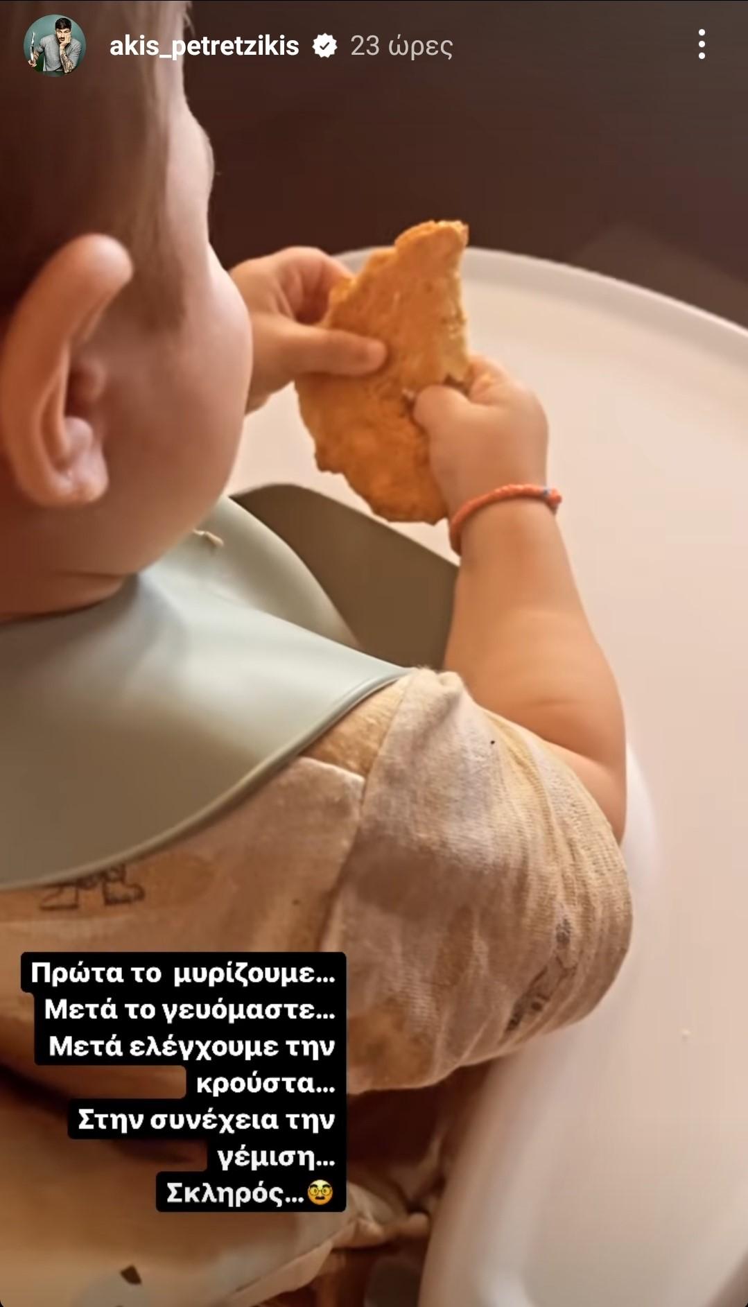 «Κουρουδάκια με τυρί κρέμα... σήμερα γκουρμέ», έγραψε στο πρώτο story που μοιράστηκε με τους followers του στο Instagram o ευτυχισμένος μπαμπάς, ενώ λίγο αργότερα ο Αχιλλέας ανέλαβε το food tasting: «Πρώτα το μυρίζουμε... Μετά το γευόμαστε... Μετά ελέγχουμε την κρούστα... Στη συνέχεια τη γέμιση...», έγραψε στο δεύτερο story όπου ο μικρός φαίνεται να ζει την απόλυτη γευστική εμπειρία.