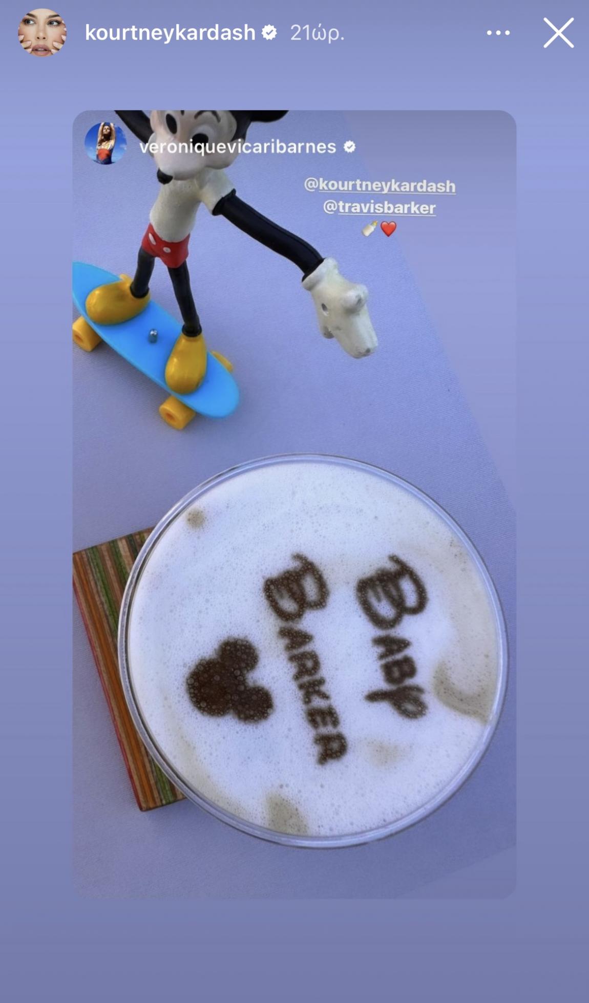 Σε ένα στιγμιότυπο από το πάρτι που κοινοποίησε στο προφίλ του στο Instagram ο Travis Barker, η σύζυγός του ποζάρει μπροστά από μια τεράστια επιγραφή που είχε στηθεί δίπλα στην πισίνα και έγραφε «Baby Barker».