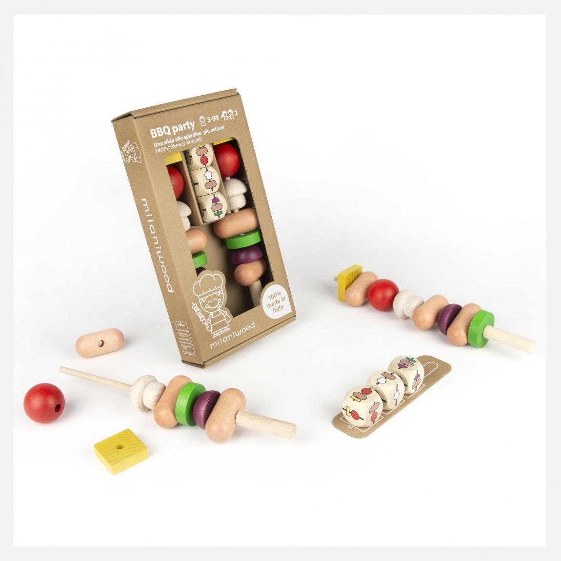 Ξύλινο επιτραπέζιο παιχνίδι «BBQ party» - Βρήκαμε ποιος φτιάχνει το πιο γρήγορο και νόστιμο σουβλάκι της πόλης! Ποιος θα καταφέρει να περάσει πιο γρήγορα στα σουβλάκια τα υλικά που εικονίζονται στα ζάρια; Ασφαλές, οικολογικό παιχνίδι με μη τοξικά χρώματα, κατασκευασμένο στην Ιταλία.
