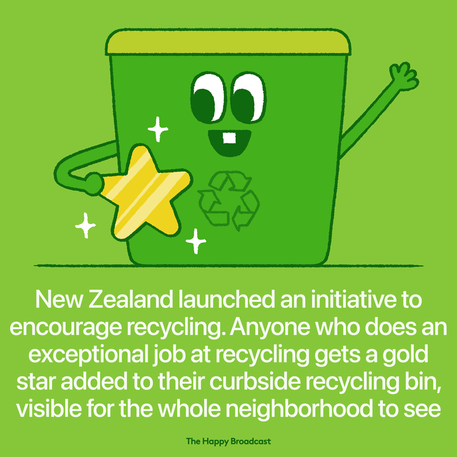 Ακόμα και στους ενήλικες αρέσει να επιβραβεύονται με ένα χρυσό αστέρι μια στο τόσο! Γι' αυτό η Νέα Ζηλανδία ενθαρρύνει τα νοικοκυριά να κάνουν όσο το δυνατόν περισσότερη ανακύκλωση ανταμείβοντας τους πιο δυνατούς στην ανακύκλωση με ένα χρυσό αστέρι, το οποίο θα μπαίνει στον κάδο ανακύκλωσής τους. Οι όχι τόσο "καλοί μαθητές" αντίθετα, λαμβάνουν προειδοποιητική επιστολή για την κατάσχεση του κάδου τους. Έτσι, τα ποσοστά ανακύκλωσης έχουν βελτιωθεί σημαντικά και για τους κατοίκους αυτή η συνήθεια έχει γίνει λατρεία. Έχουν βέβαια και το κατάλληλο κίνητρο! Μια πρωτοβουλία που αποτελεί παράδειγμα προς μίμηση και για τις υπόλοιπες χώρες!