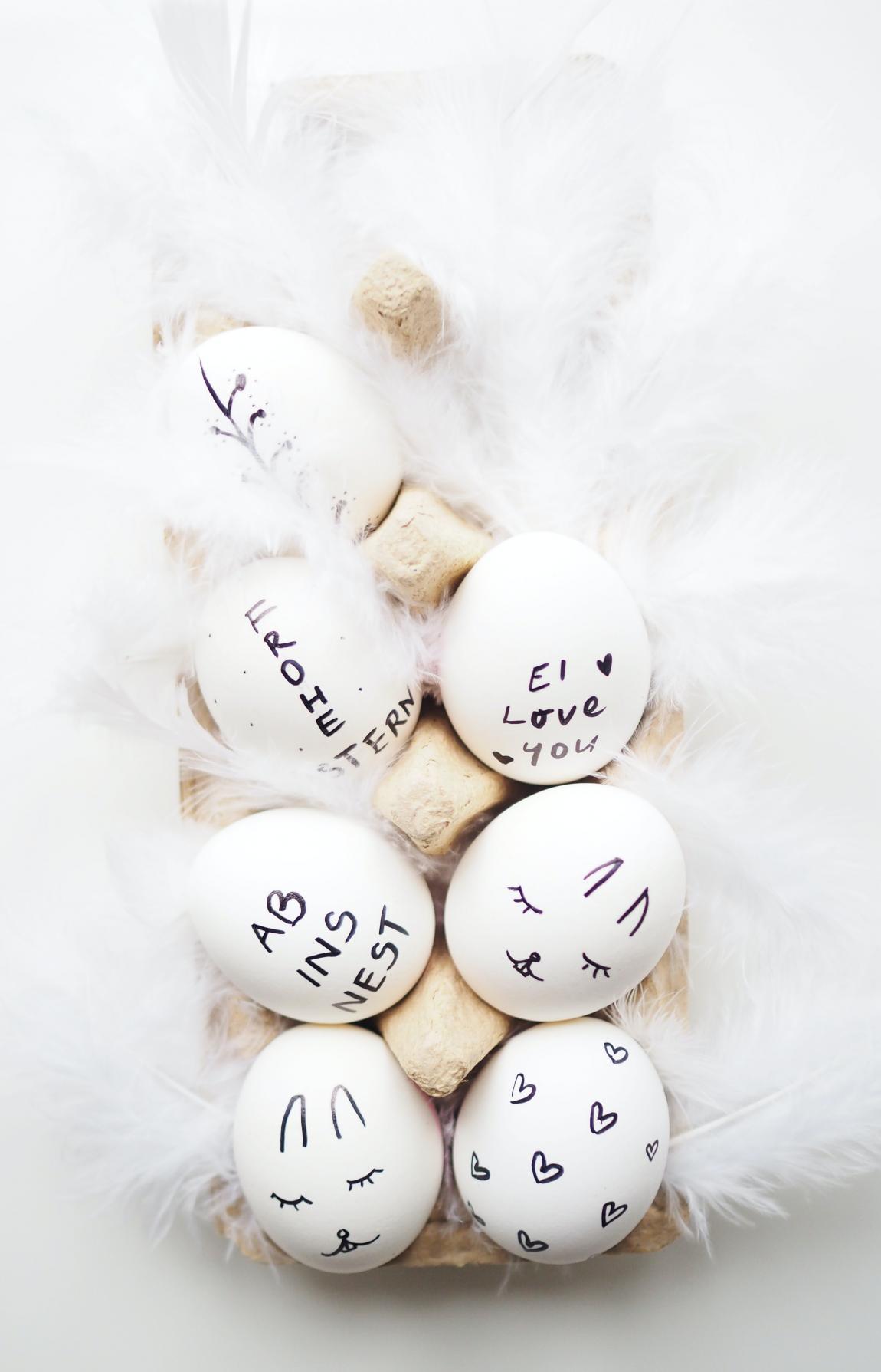Μία ακόμη εύκολη αλλά πολύ πρωτότυπη ιδέα είναι να βράσετε απλώς τα αυγά και με μαύρο ή ό,τι άλλο χρώμα μαρκαδόρο θέλετε, να βάλετε τα παιδιά τα γράψουν λέξεις-ευχές για το Πάσχα: «Υγεία», «Αγάπη», «Καλό Πάσχα», «Καλή Ανάσταση» και ό,τι άλλο μπορούν να φανταστούν!