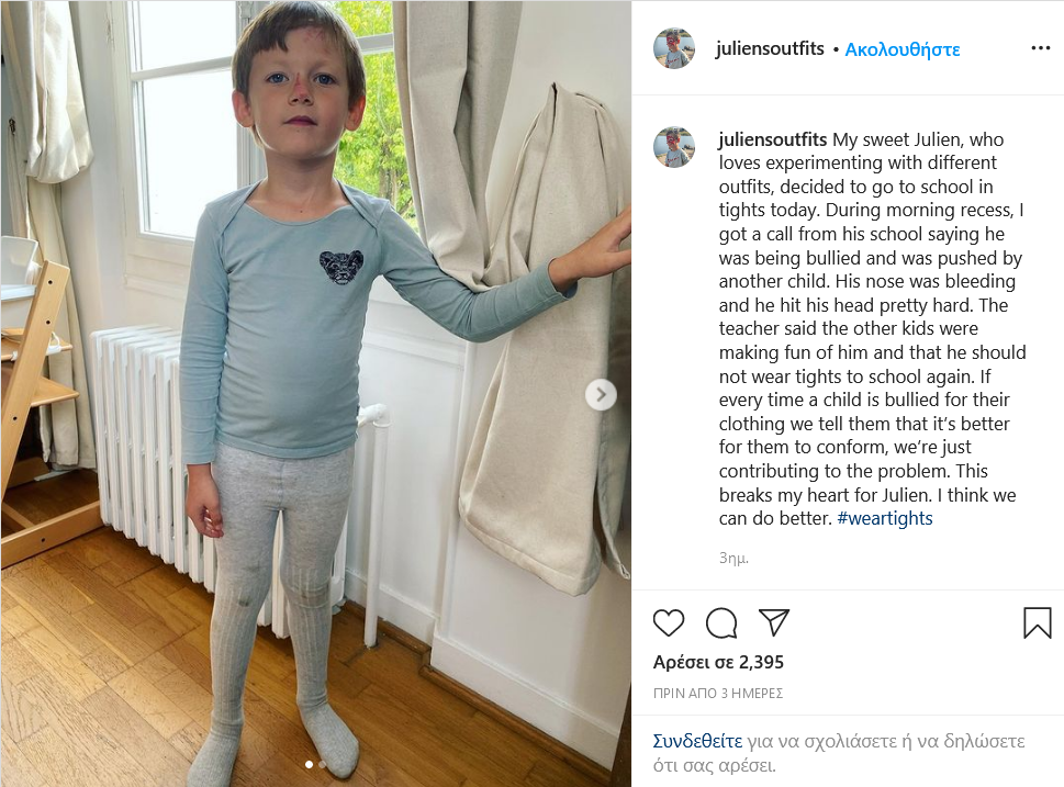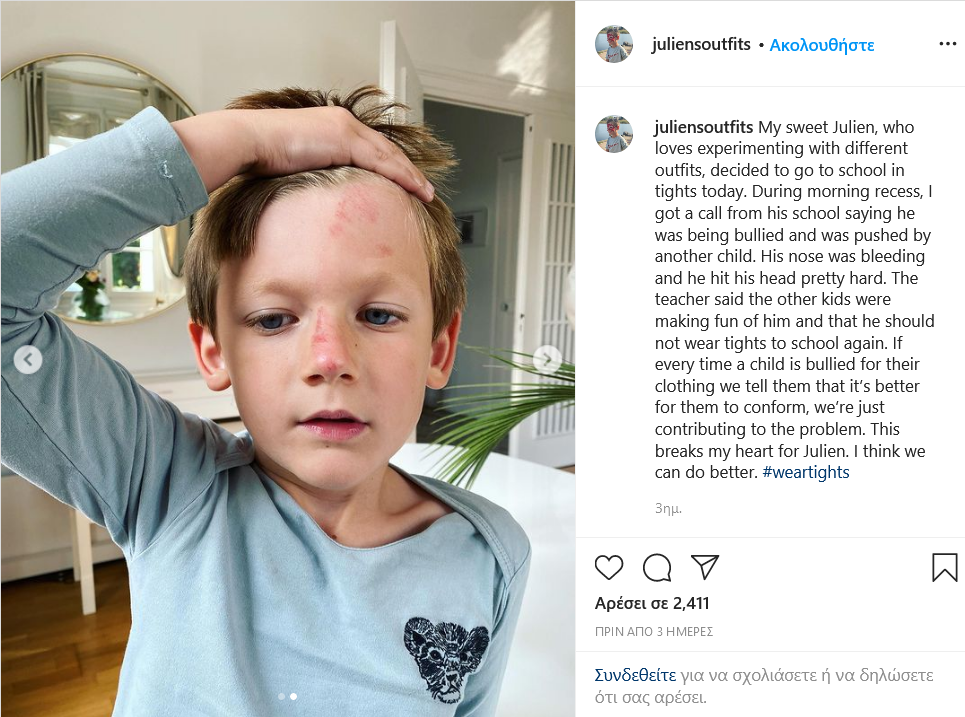 "Αν, όμως, κάθε φορά που ένα παιδί δέχεται bullying για τα ρούχα του, του ζητάμε να συμβιβαστεί, απλά ενισχύουμε το πρόβλημα. Ραγίζει η καρδιά μου για τον Julien. Μπορούμε να τα πάμε και καλύτερα. #weartights", συμπληρώνει η μαμά του και δεν θα μπορούσαμε να συμφωνούμε περισσότερο.