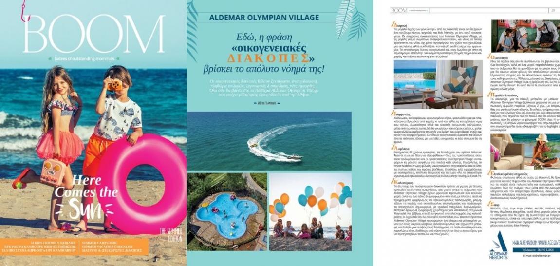 Το καλοκαίρι, για τα παιδιά, μετριέται με μπάνια! Το Aldemar Olympian Village βρίσκεται μπροστά σε μια εντυπωσιακή, αμμώδη παραλία, μήκους 2 χλμ., με απέραντη θέα στο γαλήνιο Ιόνιο πέλαγος. Επιπλέον, ανάμεσα στις 22 πισίνες του ξενοδοχείου βρίσκονται και δύο αποκλειστικά παιδικές, που σημαίνει πως τα παιδιά σας θα κάνουν τόσα μπάνια, που θα χάσουν το μέτρημα! BOOM plus: Η εντυπωσιακή, 93 μέτρων νεροτσουλήθρα που περιλαμβάνεται στο συγκρότημα θα είναι αδιαμφισβήτητα το highlight του καλοκαιριού!