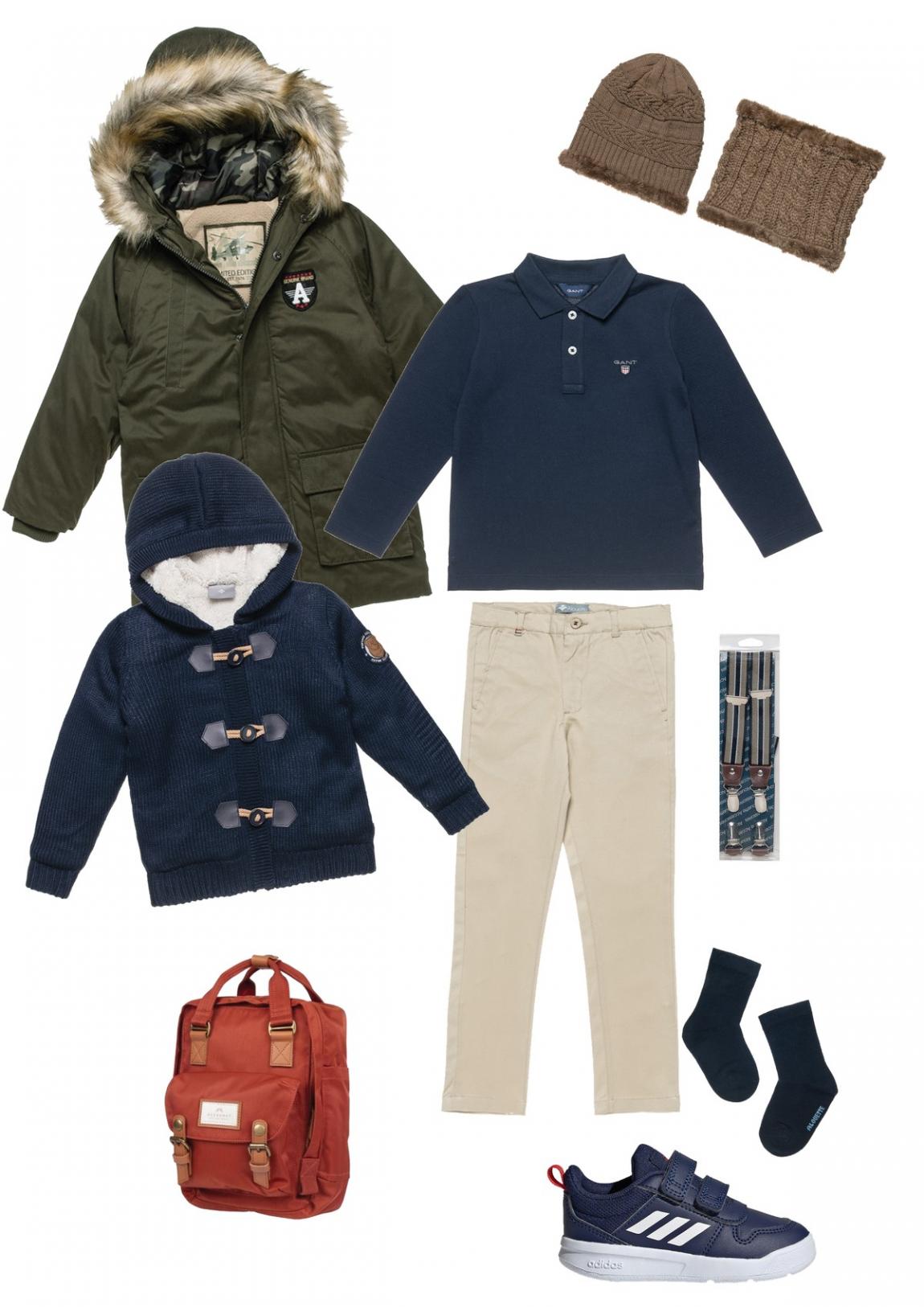 Το πρώτο γιορτινό look για τους μικρούς gentlemen έχει έναν chic-casual αέρα, ένα ύφος ανεπιτήδευτου στιλ, και είναι βασισμένο σε γήινους, κλασικούς χρωματισμούς. Ξεκινάμε με ένα μπεζ chino παντελόνι σε ίσια γραμμή με διακριτικά διακοσμητικά στο χαρακτηριστικό στιλ της Alouette. Πρόκειται για ένα παντελόνι που συνδυάζει αντοχή, άνεση, χαμηλό βάρος και statement εμφανίσεις, ενώ είναι ευκολοφόρετο και μπορεί να συνδυαστεί με τα πάντα! Εδώ το συνδυάζουμε με μια βαμβακερή polo μπλούζα Gant σε μπλε χρώμα, με κέντημα στο μπροστινό μέρος. Προσθέτουμε μια ζεστή πλεκτή ζακέτα στο ίδιο χρώμα, με απαλή γούνινη επένδυση, κουμπιά Montgomery με μπλε δερματίνη και ένα ραφτό στο μανίκι σε ιδιαίτερο design με το logo της Alouette. Το styling διανθίζεται με ψηλές κάλτσες Alouette, μπλε παπούτσια Adidas, ένα πλεκτό σετ που αποτελείται από γιακά και σκούφο σε μια ζεστή καφέ απόχρωση, και μια κεραμιδί τσάντα πλάτης για το iPad, το βιβλίο και τα μελομακάρονα, ενώ οι τιράντες σε μπεζ-μπλε απόχρωση δίνουν μια πινελιά που «δένει» όλο το look. Το απίθανο παρκά μπουφάν σε επίσης γήινες αποχρώσεις – λαδί, μπεζ fleece επένδυση, γούνα και μοτίβο παραλλαγής στο εσωτερικό της αποσπώμενης κουκούλας – διακοσμημένο με υφασμάτινα patch, ραφτά και τσέπες, απογειώνει αυτό το στιλάτο look για τους μικρούς μας φίλους!