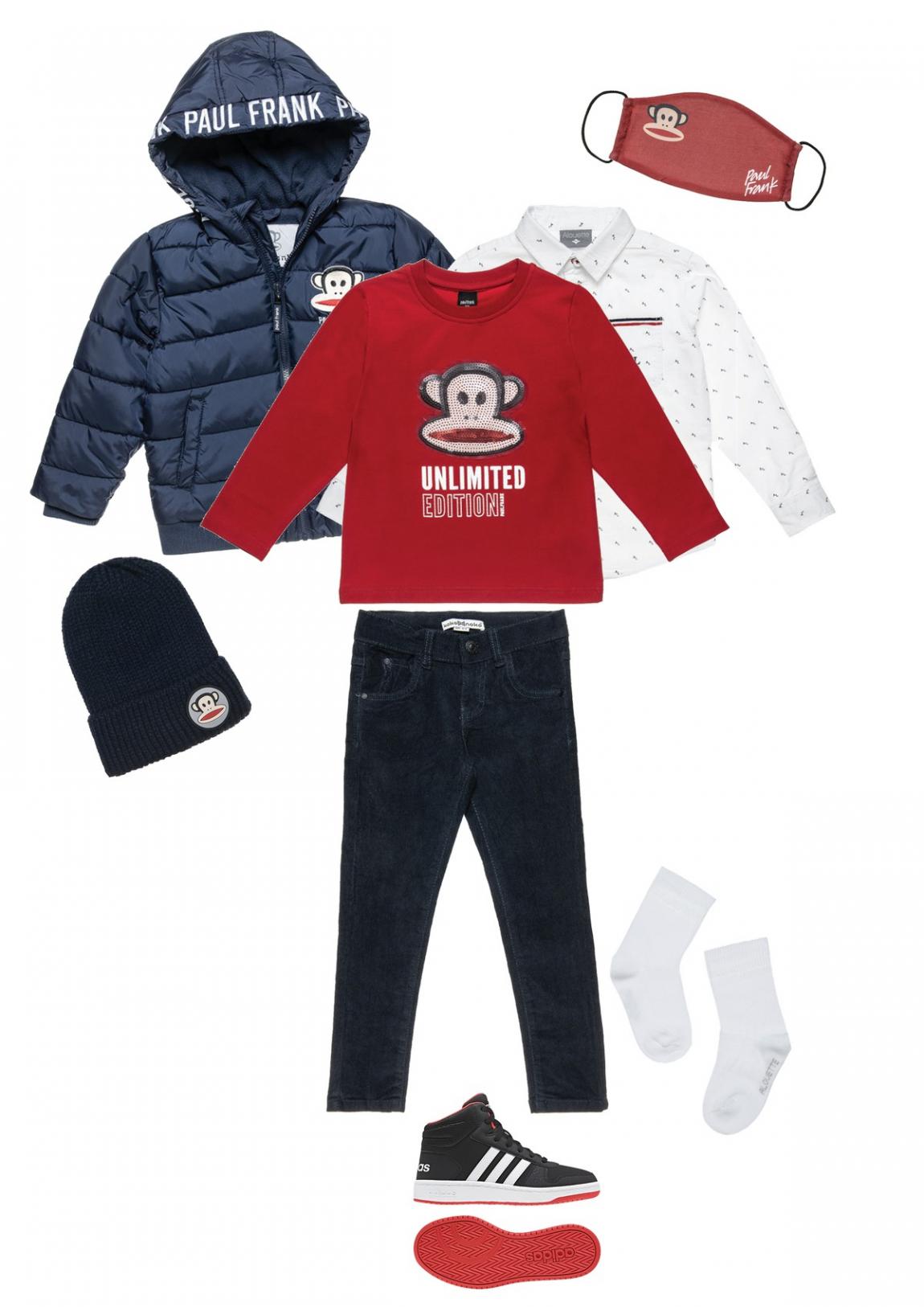 Αυτό το look είναι μια ωδή στον αγαπημένο φίλο των παιδιών, τον πρωταγωνιστή του "Paul Frank", Julius! Είναι βασισμένο στο πιο γιορτινό χρώμα, το κόκκινο, και έχει μια ιδιαίτερα funky διάθεση που προορίζεται για μικρά style icons! Μια κόκκινη βαμβακερή μπλούζα αποτελεί τη βάση του look, η οποία όμως απογειώνεται με τις χρωματιστές παγέτες που σχηματίζουν το πρόσωπο του Julius, και την τεχνική puff στο lettering, που τους δίνει μια απαλή ανάγλυφη υφή. Το λευκό πουκάμισο με το all-over τύπωμα, την τρίχρωμη φακαρόλα, το κέντημα και την τσέπη στο πέτο, κάνει peek-a-boo! μέσα από την μπλούζα καθιστώντας αμέσως το outfit κατάλληλο για το χριστουγεννιάτικο ρεβεγιόν, ενώ το μπλε κοτλέ παντελόνι προσθέτει σκοπιμότητα και υφή στο look. Τα ψηλά μποτάκια Adidas με τη κόκκινη σόλα είναι το πλέον κατάλληλο παπούτσι για τον χειμώνα, μαζί με ψηλές λευκές κάλτσες Alouette, ενώ, σκεπτόμενοι τους καιρούς που ζούμε, δεν θα μπορούσαμε να παραλείψουμε μια ασορτί κόκκινη υφασμάτινη μάσκα προστασίας Paul Frank. Το look ολοκληρώνεται με τον μπλε σκούρο πλεκτό σκούφο με τη λευκή επένδυση και το rubber label "Paul Frank" που θα κρατάει ζεστά τα κεφαλάκια τους, και ένα μπουφάν άριστης κατασκευής του ίδιου ήρωα, με λεπτομέρειες όπως κεντήματα και ραφτά να του προσδίδουν την υπογραφή της Alouette.