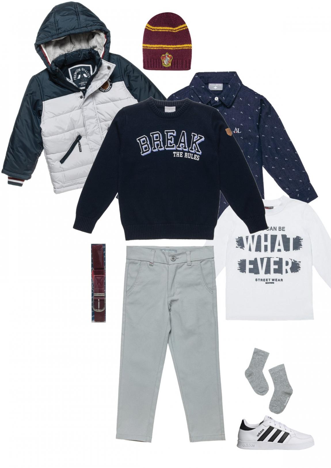 Το τρίτο look για τους μικρούς μας φίλους χαρακτηρίζεται από μια πιο ψυχρή χρωματική παλέτα συγκριτικά με τα δύο προηγούμενα, και μια κολεγιακή διάθεση που θα μπορούσε να το κάνει casual, πράγμα όπως που δεν συμβαίνει, χάρη στις προσεγμένες λεπτομέρειες που κοσμούν τα επιμέρους κομμάτια. Αυτή τη φορά προτείνουμε το chino παντελόνι, σε γκρι απόχρωση, να συνδυαστεί με ένα πλεκτό μπλε πουλόβερ με τύπωμα σε γαλάζιους και λευκούς χρωματισμούς και faux-leather patch με ανάγλυφο design. Βασιζόμαστε στο layering με ένα μπλε πουκάμισο με λευκό all-over print και εσωτερικά μια βαμβακερή μπλούζα με minimal ανάγλυφο τύπωμα, αφού γνωρίζουμε πολύ καλά πως οι μικροί μας φίλοι μπορούν πολύ εύκολα να ζεσταθούν την ώρα του παιχνιδιού με τα αδελφάκια και ξαδελφάκια τους γύρω από το γιορτινό τραπέζι. Τι άλλο θα συμπλήρωνε καλύτερα την κολεγιακή διάθεση αυτού του look, από έναν σκούφο Harry Potter με χοντρή πλέξη σε γκρενά απόχρωση; Ίσως μια ζώνη στην ίδια απόχρωση, ή ακόμα καλύτερα, ένα μπουφάν με τρίχρωμες μανσέτες, αποσπώμενη κουκούλα με fleece επένδυση, κοψίματα και διχρωμίες, τσέπες, κεντήματα και ραφτά. Έτοιμο το look!