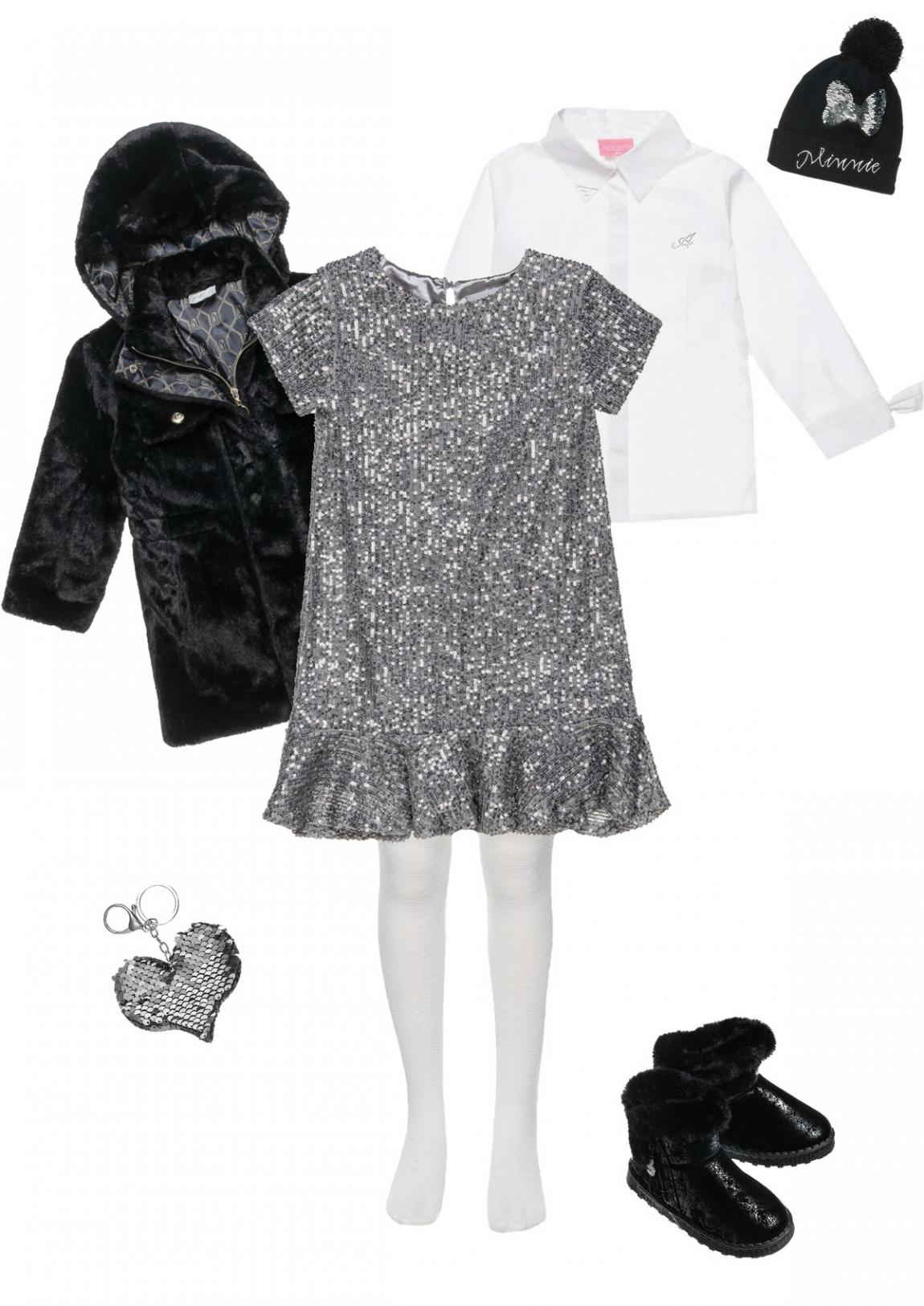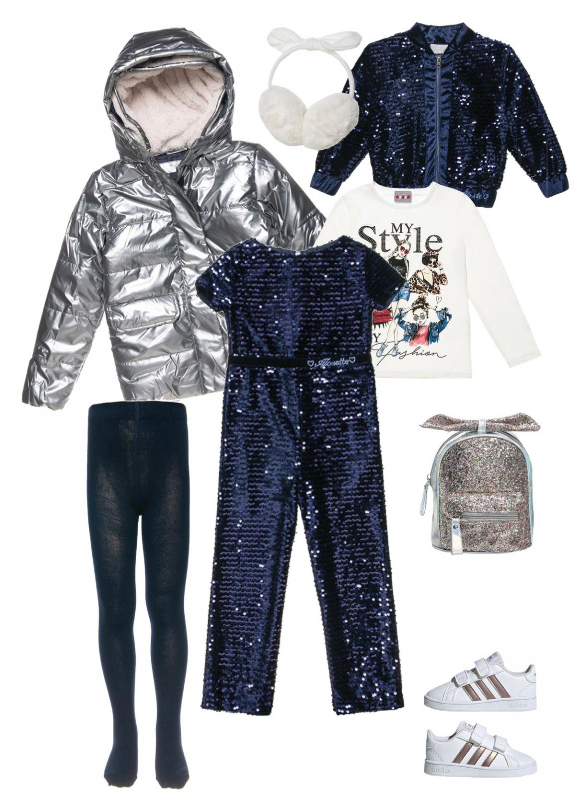 Το τρίτο look για τις μικρές fashion addicted είναι και το πιο ιδιαίτερο. Στο επίκεντρο βρίσκεται μια απίθανη ολόσωμη φόρμα σε ένα πλούσιο, βαθύ μπλε χρώμα με ιριδίζουσες παγέτες, ενώ εδώ δίνεται έμφαση στην τάση του layering. Προσθέτουμε ένα μπλε βαμβακερό καλσόν, κατάλληλο για τις κρύες ημέρες του χειμώνα, και μια φανταστική μπλούζα από την "Five Star" συλλογή της Alouette – ναι, δεν θα είναι σε πρώτο πλάνο, αλλά όλοι νιώθουμε καλύτερα όταν είμαστε περιποιημένοι από την κορφή έως τα νύχια – και άλλωστε, η σύνθεσή της είναι τόσο απαλή, που τα κορίτσια μας θα ευχαριστηθούν να τη φορούν. Συνεχίζουμε με μια ασορτί μπλε ζακέτα με πούλιες σε bomber ύφος, συνδυάζοντας κομμάτια που είναι κρίμα να μη φορεθούν μαζί, και ολοκληρώνουμε το look με παπούτσια Adidas με χρυσές λεπτομέρειες, μια τσάντα πλάτης με χρυσό στρας για τις μικρές κυρίες που θέλουν πάντα τα προσωπικά τους αντικείμενα μαζί τους, γούνινα αυτάκια και ένα συγκλονιστικό ασημένιο μπουφάν με γούνινη επένδυση. Στοιχεία όπως η βελούδινη κορδέλα στη μέση της ολόσωμης φόρμας με τα στρας που σχηματίζουν το logo της Alouette, αλλά και ο tone-sur-tone συνδυασμός με τη ζακέτα, έρχονται σε αντιπαραβολή με τα πιο αθλητικά κομμάτια όπως τα παπούτσια και η βαμβακερή μπλούζα, και εκεί έγκειται η ιδιαιτερότητα αυτού του look: εντυπωσιακό στιλ για όλα τα γούστα και άνεση στο ρεβεγιόν, but make it fashion!