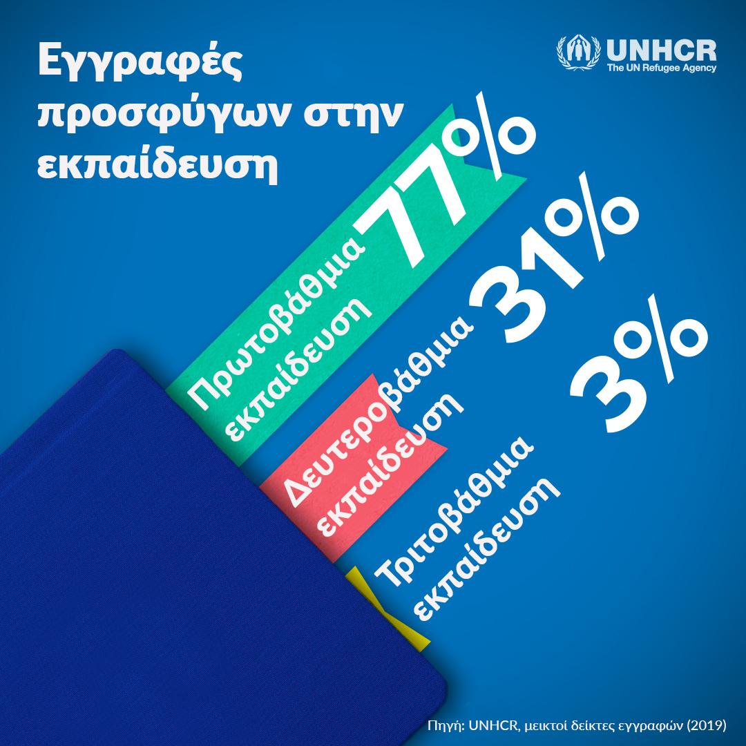 Τα στοιχεία του 2019 που παρουσιάζει η έκθεση βασίζονται σε αναφορές από δώδεκα χώρες, οι οποίες φιλοξενούν περισσότερα από τα μισά παιδιά πρόσφυγες όλου του κόσμου. Αν και το μεικτό ποσοστό εγγραφών στο δημοτικό σχολείο φτάνει στο 77%, μόνο το 31% των νέων εγγράφονται στη δευτεροβάθμια εκπαίδευση. Στην τριτοβάθμια εκπαίδευση εγγράφεται μόνο το 3% των νέων προσφύγων.