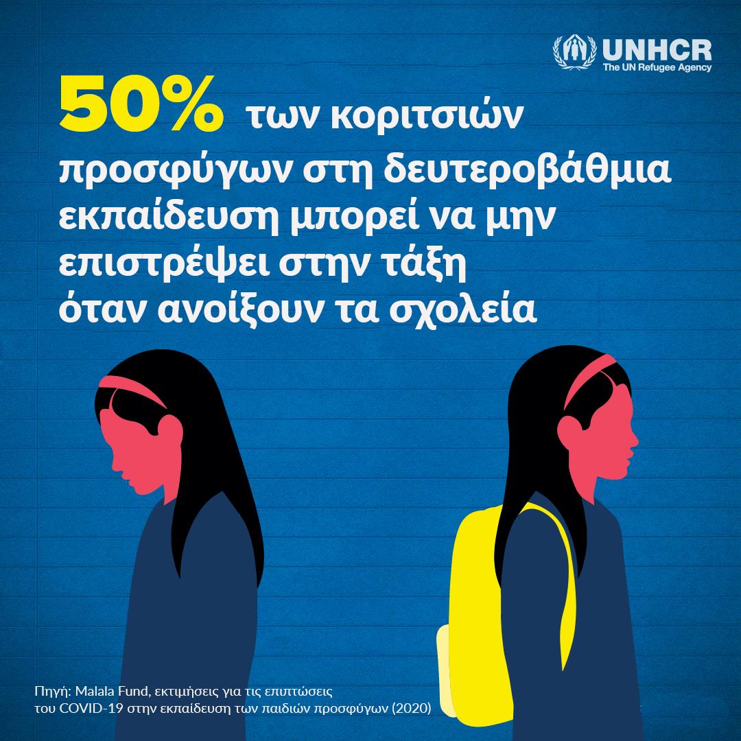 Τα κορίτσια πρόσφυγες ήδη έχουν μικρότερη πρόσβαση στην εκπαίδευση από τα αγόρια και έχουν τις μισές πιθανότητες να εγγραφούν στο σχολείο μέχρι να φτάσουν στη δευτεροβάθμια εκπαίδευση. Βασιζόμενη σε στοιχεία της Ύπατης Αρμοστείας του ΟΗΕ για τους Πρόσφυγες, η οργάνωση Malala Fund εκτιμά ότι λόγω του κορωνοϊού τα μισά από τα κορίτσια πρόσφυγες στη δευτεροβάθμια εκπαίδευση δεν θα επιστρέψουν στις τάξεις τους όταν ξανανοίξουν τα σχολεία αυτόν τον μήνα. Στις χώρες όπου το μεικτό ποσοστό των εγγεγραμμένων κοριτσιών προσφύγων στην δευτεροβάθμια εκπαίδευση ήταν ήδη κάτω του 10%, το σύνολο των κοριτσιών αυτών διατρέχει τον κίνδυνο να παρατήσει το σχολείο για πάντα, μια ανησυχητική πρόβλεψη που θα είχε μεγάλο αντίκτυπο στις επόμενες γενιές.