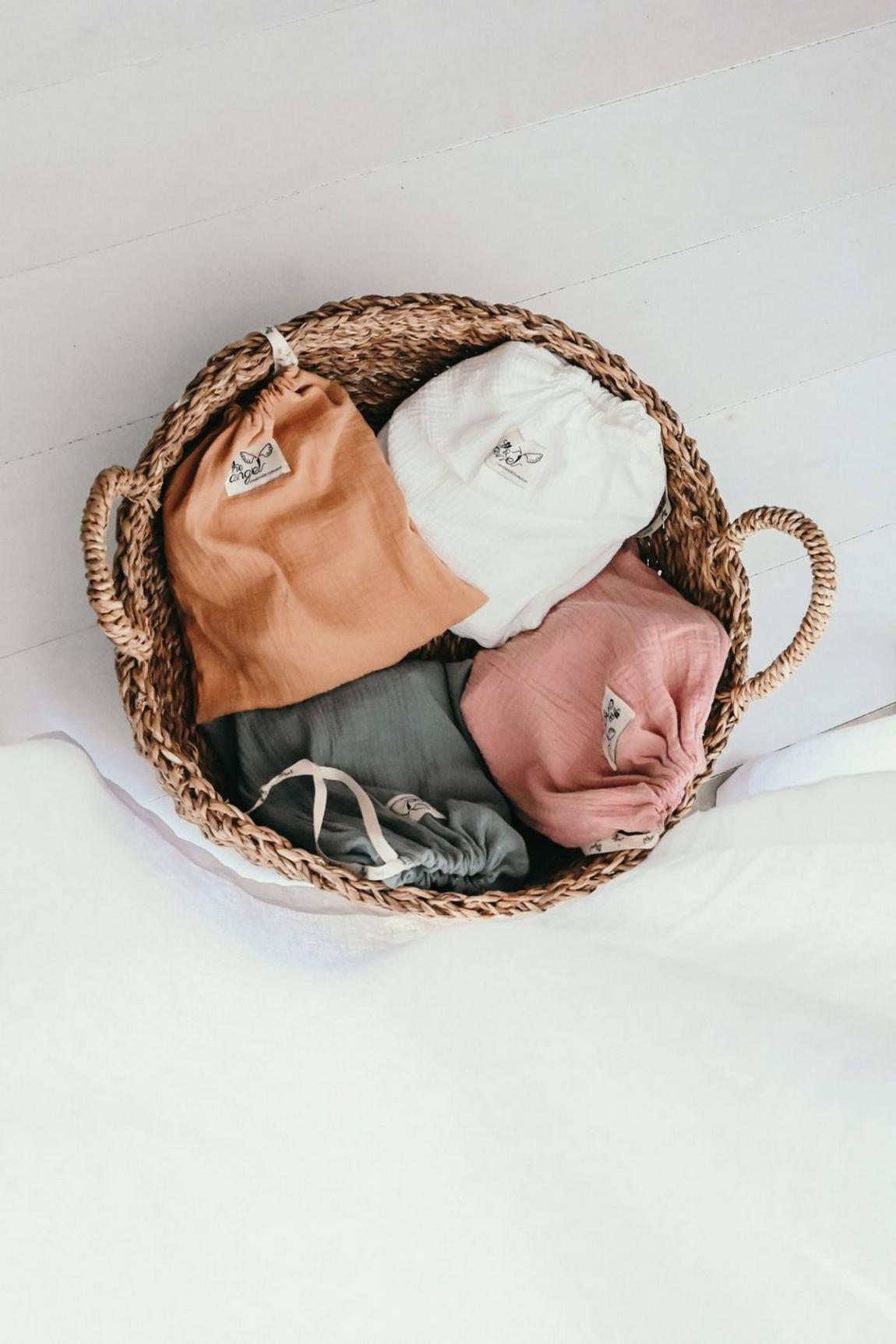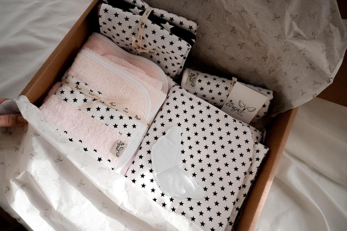 #9 Newborn Muslin Set: Πιο απαλό σετ για το ευαίσθητο δερματάκι του μωρού δεν υπάρχει! Είναι κατασκευασμένο από οργανική βαμβακερή μουσελίνα και περιλαμβάνει μία πάνα αγκαλιάς με κουκούλα- κατάλληλη για το σπίτι, τη βόλτα και κάθε έξοδο-, ένα πανάκι φροντίδας και ένα νάνι Angel Wings, μέσα στο πουγκί τους.
