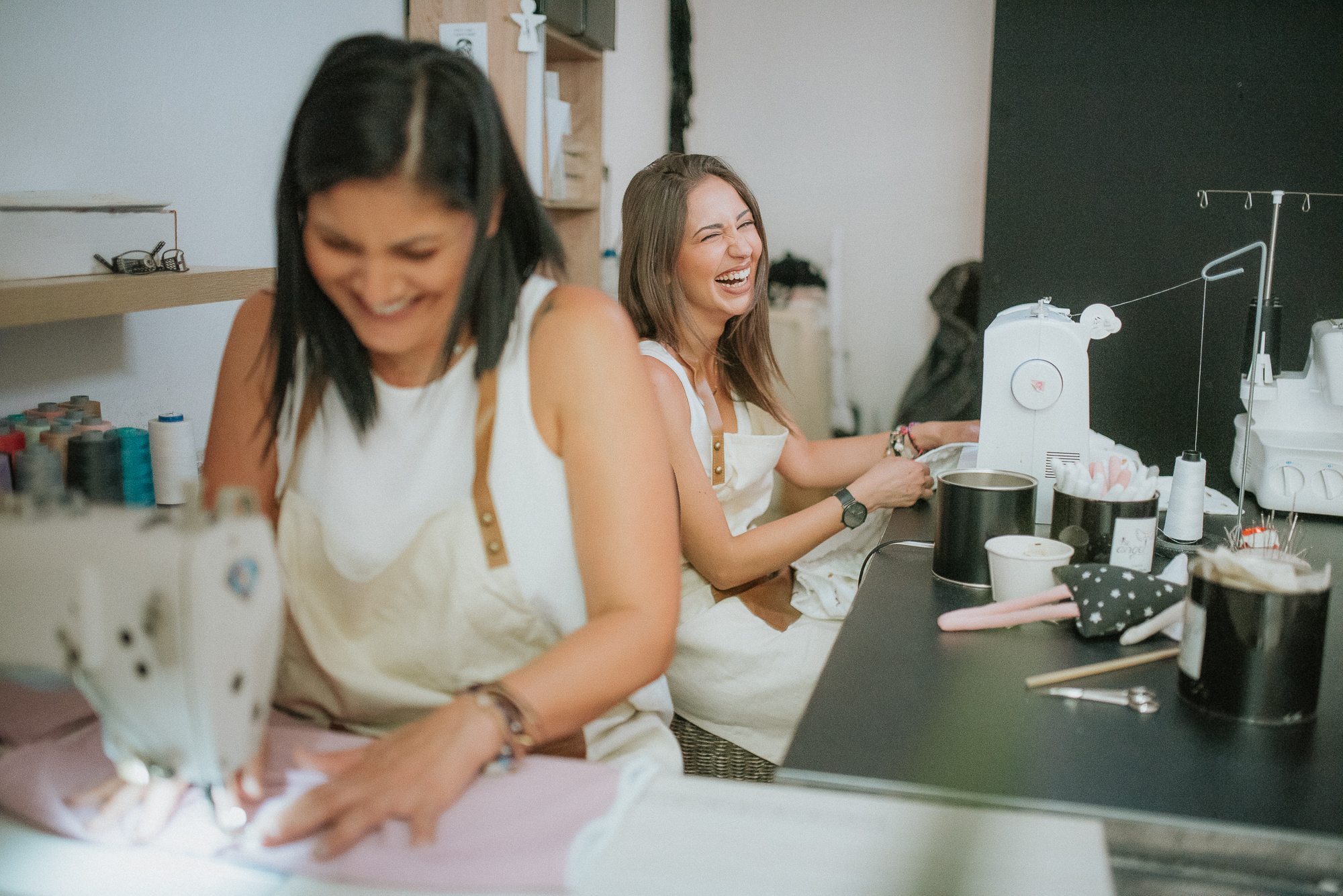 Η κάθε μας μέρα ξεκινάει ανάμεσα σε υφάσματα, χρώματα, βελόνες και κλωστές. Το workshop μας είναι το δεύτερό μας σπίτι. Παρά την καθημερινή πίεση, το γέλιο και η θετική ενέργεια δε λείπουν ποτέ! Αυτή η χημεία που υπάρχει μεταξύ μας είναι και η επιτυχία της συνεργασίας μας. Είμαστε αυτό που λένε κόψε-ράψε, στην κυριολεξία η μία κόβει και η άλλη ράβει. Η καθεμία έχει τις δικές της ευθύνες που πρέπει να φέρει εις πέρας και όλα κυλούν ομαλά.