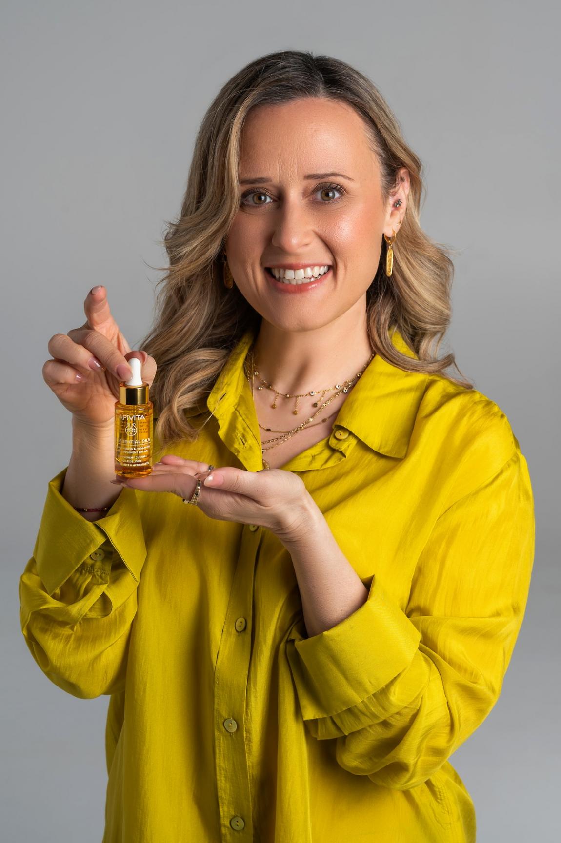 Η Λίνα δεν αποχωρίζεται το έλαιο προσώπου ημέρας Beessential Oils, ένα μοναδικό συμπλήρωμα ενδυνάμωσης και ενυδάτωσης της επιδερμίδας | photo: Αλέξανδρος Μακρής