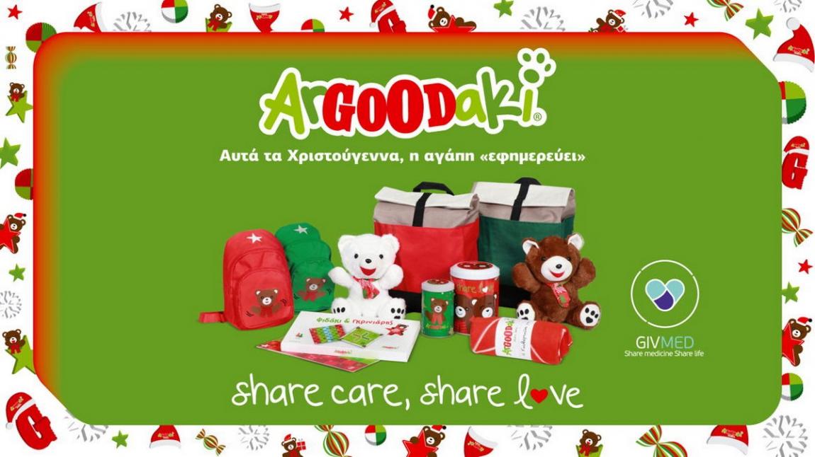 Με κεντρικό μήνυμα Η αγάπη «εφημερεύει», το ArGOODaki καλεί τον κόσμο να μοιράσει αγάπη και να πάρει μέρος στην εκστρατεία προσφοράς του GIVMED, «MEDforCHILDREN». Παραγγέλνοντας ένα γεύμα ArGOODaki και επιλέγοντας ένα δώρο ανάμεσα στα είδη της φετινής σειράς – το κλασικό και αγαπημένο λούτρινο λευκό ή καφέ ArGOODaki, παιδικά τσαντάκια chest bags σε 2 χρώματα, ενήλικα backpacks σε 2 χρώματα, επιτραπέζιο φιδάκι/γκρινιάρης, σετ μπισκοτοδοχείων και κουβέρτα fleece– χαρίζουμε, μαζί στα παιδιά το καλύτερο «φάρμακο», τη δύναμη που δίνει η στοργή και η καλοσύνη!