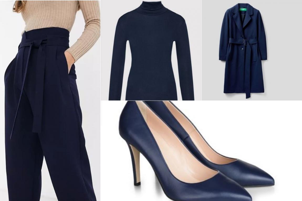 1. Navy υφασμάτινο παντελόνι, Asos  2. Σκούρο μπλε ζιβάγκο, United Colors of Benetton 3. Κλασικό τρενσκότ με ζώνη, United Colors of Benetton 4. Navy γόβες, Mourtzi