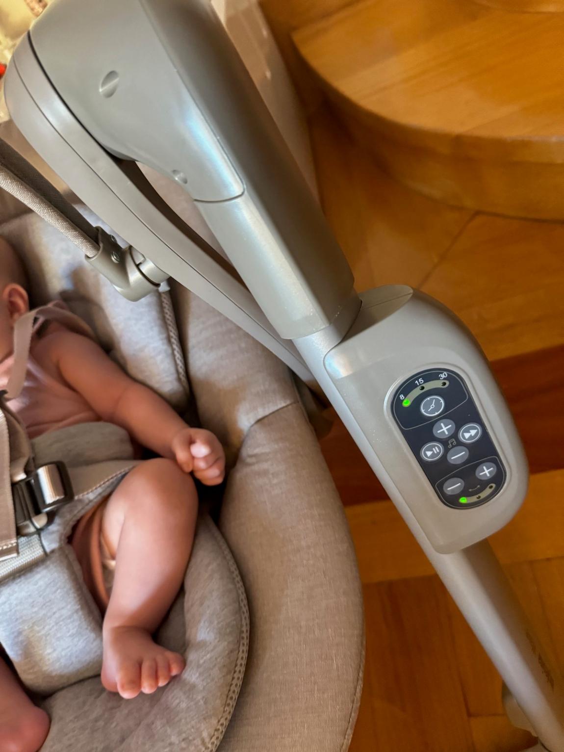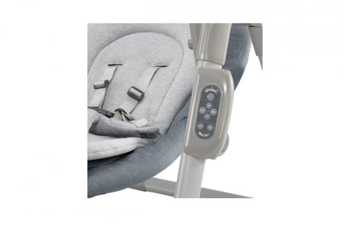 • Το χειριστήριο που είναι ενσωματωμένο στην κούνια (δεν το χάνεις ποτέ), που σου επιτρέπει να ρυθμίσεις τη μουσική, την ταχύτητα του λικνίσματος αλλά και να βάλεις χρονόμετρο με αυτόματη απενεργοποίηση, με επιλογές των 8, 15 και 30 λεπτών.